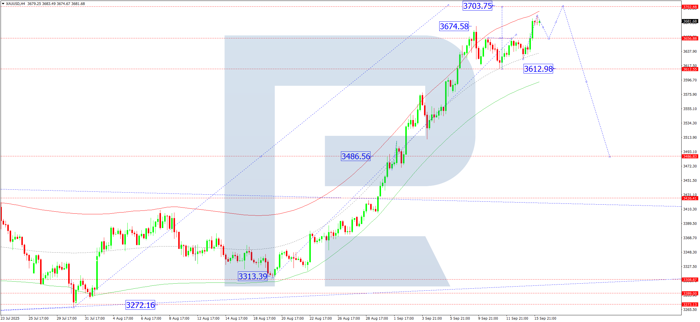 XAUUSD H4 графигінде нарық консолидация ауқымынан жоғары қарай бұзылып, 3,703 деңгейіне дейін өсу толқынының әлеуетін ашты. Бүгін, 16 қыркүйек 2025 жылы, осы деңгейге жету күтіледі. Кейінірек 3,486 деңгейіне дейін төмендеу басталуы мүмкін, әрі қарай 3,333 деңгейіне дейін қозғалыс жалғасуы ықтимал.
