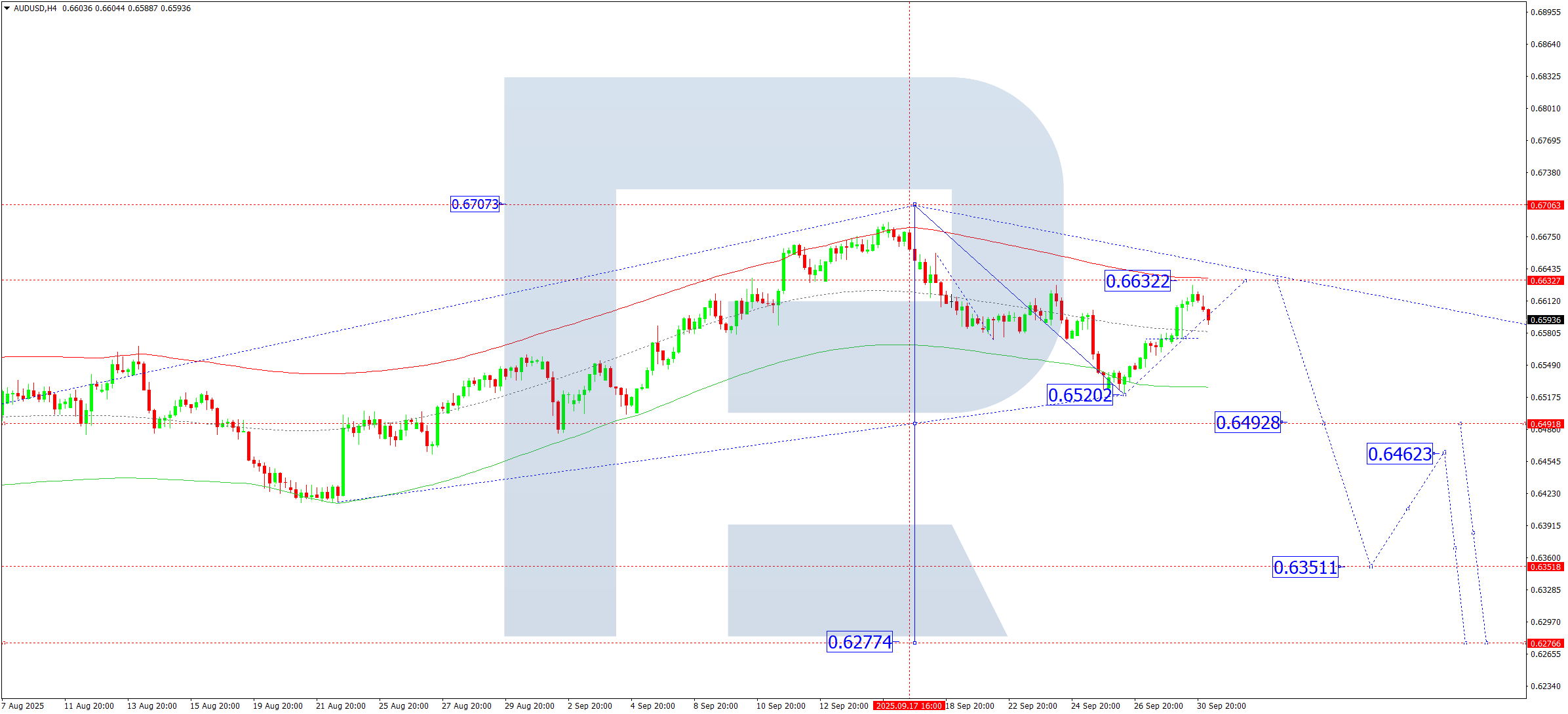 AUDUSD жұбының H4 графигінде нарық 0.6575 маңында консолидация ауқымын қалыптастырып, жоғары қарай бұзды және түзетуді 0.6633 дейін жалғастыруда. Бүгін, 1 қазан 2025 жылы, бұл түзету аяқталғаннан кейін 0.6493 дейін жаңа төмендеу толқыны басталуы мүмкін. Егер бұл деңгей бұзылса, төмендеу 0.6350 дейін жалғасуы ықтимал.