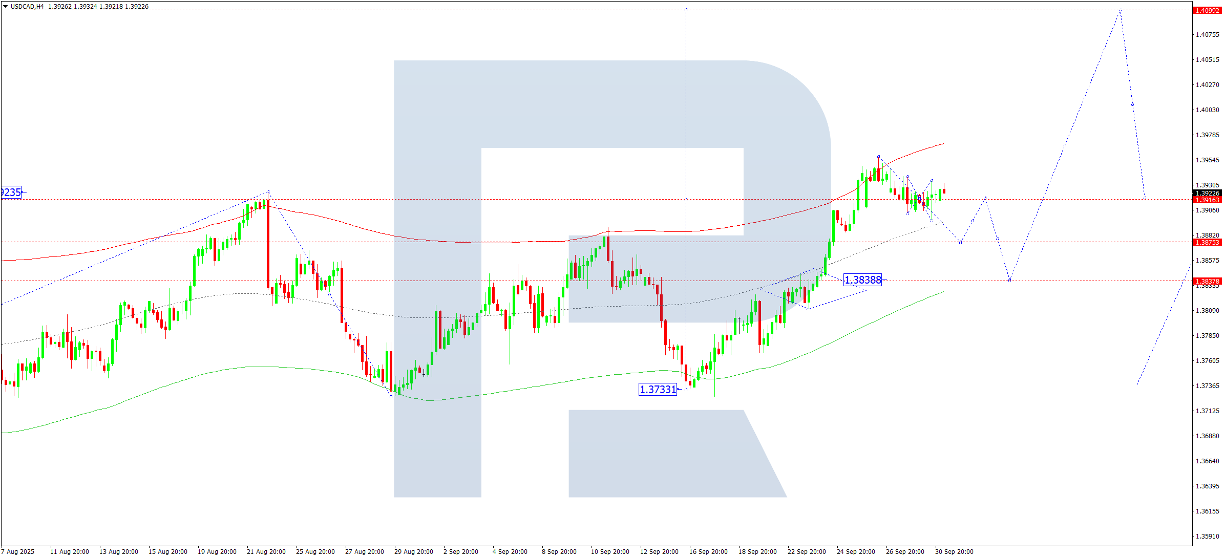 USDCAD жұбының H4 графигінде нарық 1.3916 деңгейі маңында консолидация ауқымын құруда. Бүгін, 1 қазан 2025 жылы, төменге қарай бұзылу 1.3875 деңгейіне дейін түзетуді жалғастыруы мүмкін, әрі қарай 1.3838 деңгейіне дейін кеңеюі ықтимал. Бұл түзетуден кейін 1.3970 деңгейіне дейін жаңа жоғары толқын басталуы мүмкін, әрі қарай трендтің жергілікті мақсаты ретінде 1.4100 деңгейіне дейін жалғасуы ықтимал.