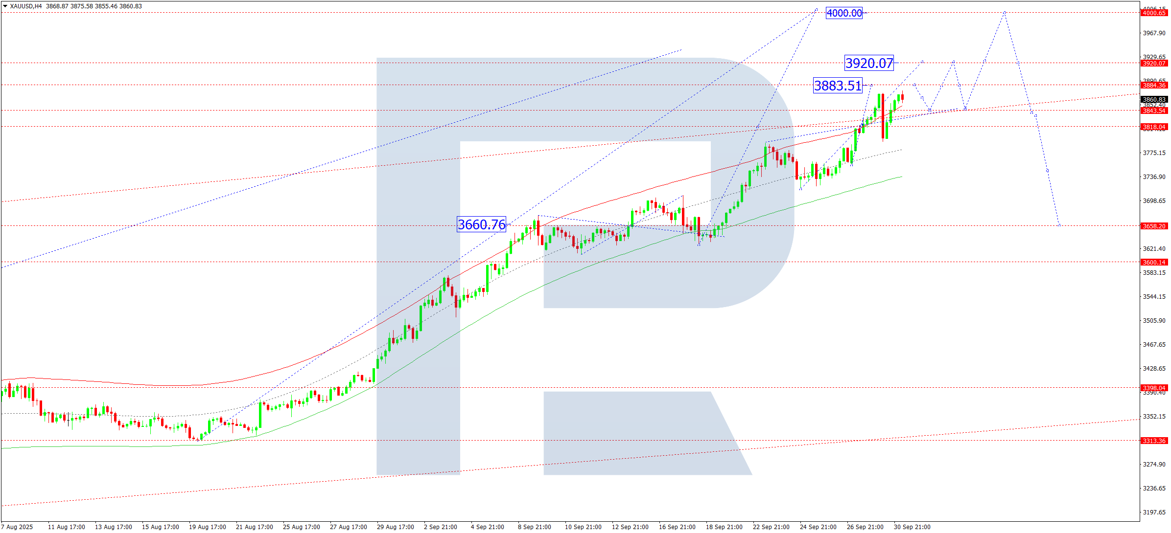 XAUUSD жұбының H4 графигінде нарық 3870 дейін өсу толқынын және 3795 дейін түзетуді аяқтады. Қазіргі уақытта осы деңгейден жоғары консолидация ауқымы қалыптасты. Бүгін, 1 қазан 2025 жылы, жоғары қарай бұзылу 3883 дейін өсу толқынын жалғастыруы мүмкін. Бұл деңгей бұзылса, тренд 3920 дейін кеңеюі мүмкін – жергілікті мақсат ретінде.