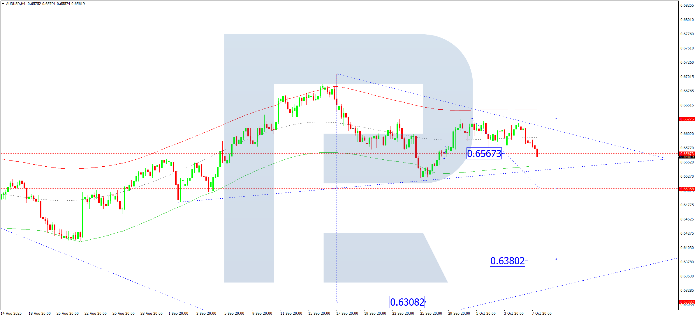 H4 графигінде AUDUSD жұбы 0.6627 деңгейінен төмен консолидация ауқымын қалыптастырды. 2025 жылғы 8 қазанда жұп 0.6567 деңгейінен төмен түсті, бұл 0.6505 деңгейіне дейін төмендеудің мүмкіндігін ашты. Осы деңгейге жеткеннен кейін тар консолидация ауқымы пайда болуы мүмкін. Егер бұл ауқымнан төменге бұзылса, тренд 0.6380 деңгейіне дейін жалғасуы ықтимал.