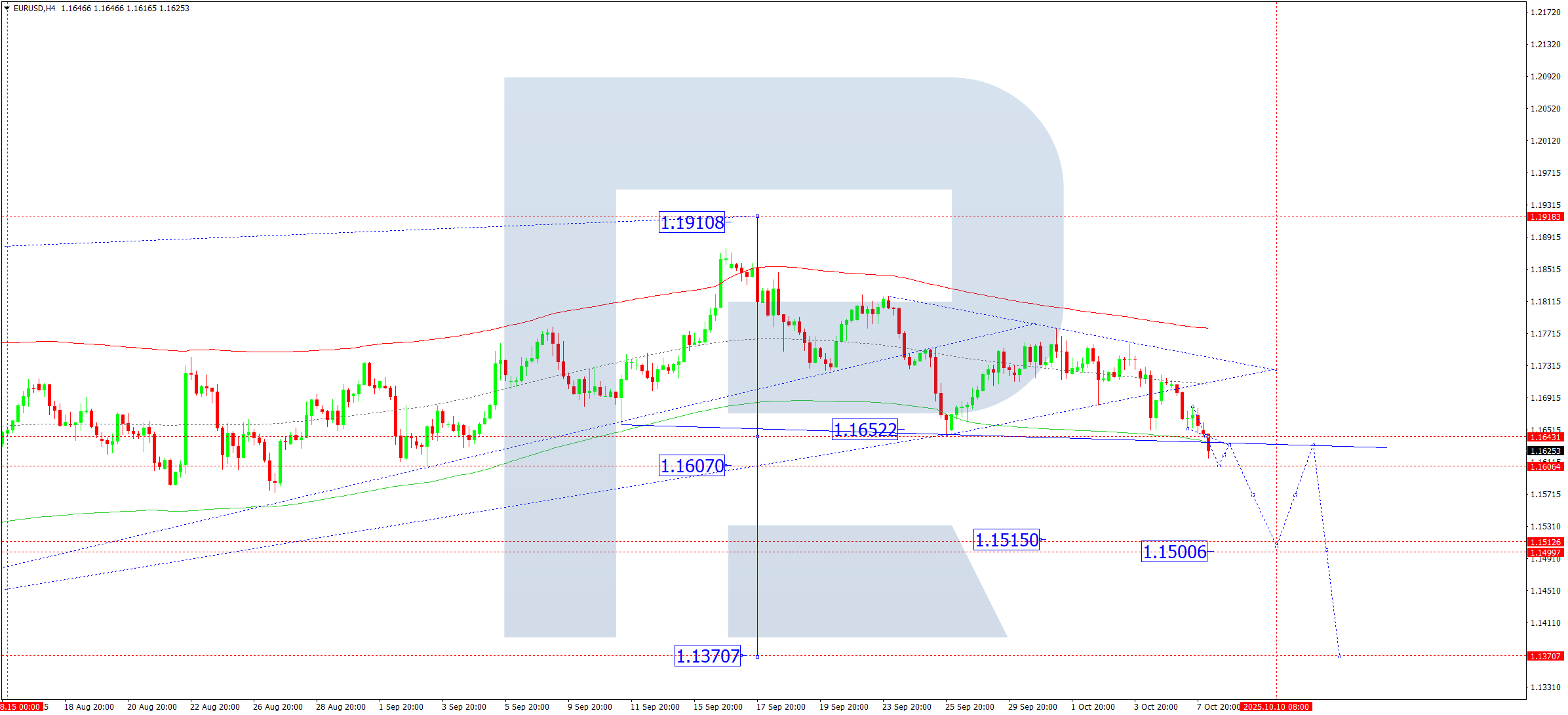 H4 графигінде EURUSD жұбы қысқа мерзімді түрде 1.1680 деңгейіне дейін өсіп, кейін 1.1643 деңгейінен төмен түсті. Бұл деңгей маңында шағын консолидация ауқымы қалыптасты. 2025 жылғы 8 қазанда нарық бұл ауқымды төмен бағытта бұзып өтті, бұл төмендеудің үшінші толқынына жол ашып, 1.1515 деңгейіне дейін, әрі қарай 1.1500 деңгейіне дейін төмендеуді жалғастыру мүмкіндігін көрсетті.
