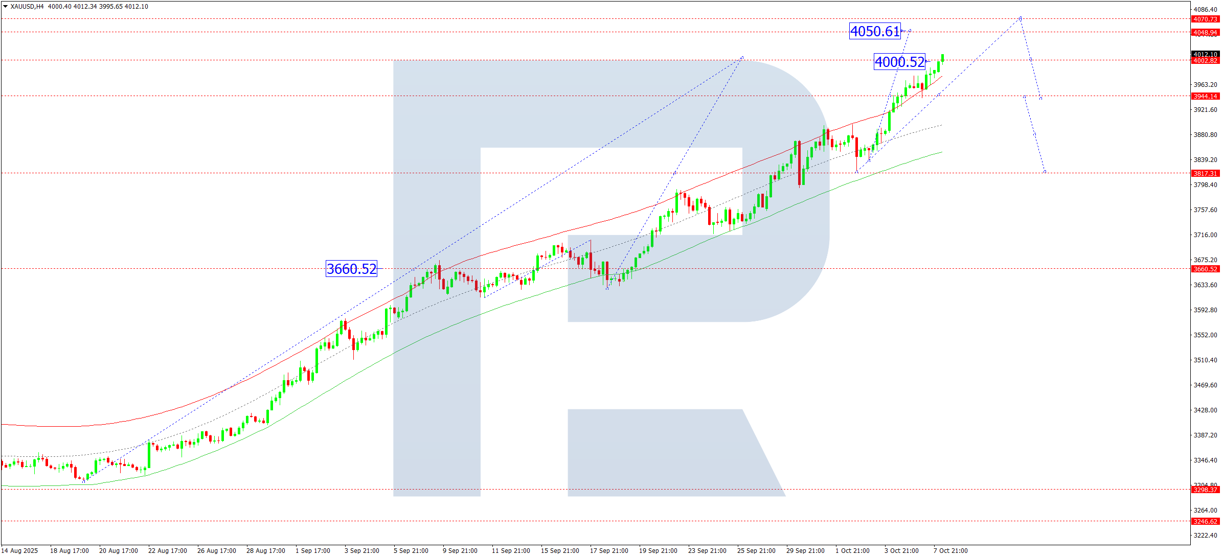 H4 графигінде XAUUSD 4 050 деңгейіне дейін өсу қозғалысын жалғастыруда. 2025 жылғы 8 қазанда бұл мақсатты деңгейге жетеді деп күтілуде. Кейін 3 944 деңгейіне дейін түзету болуы мүмкін, одан соң 4 070 бағытына жаңа өсу толқыны басталады.