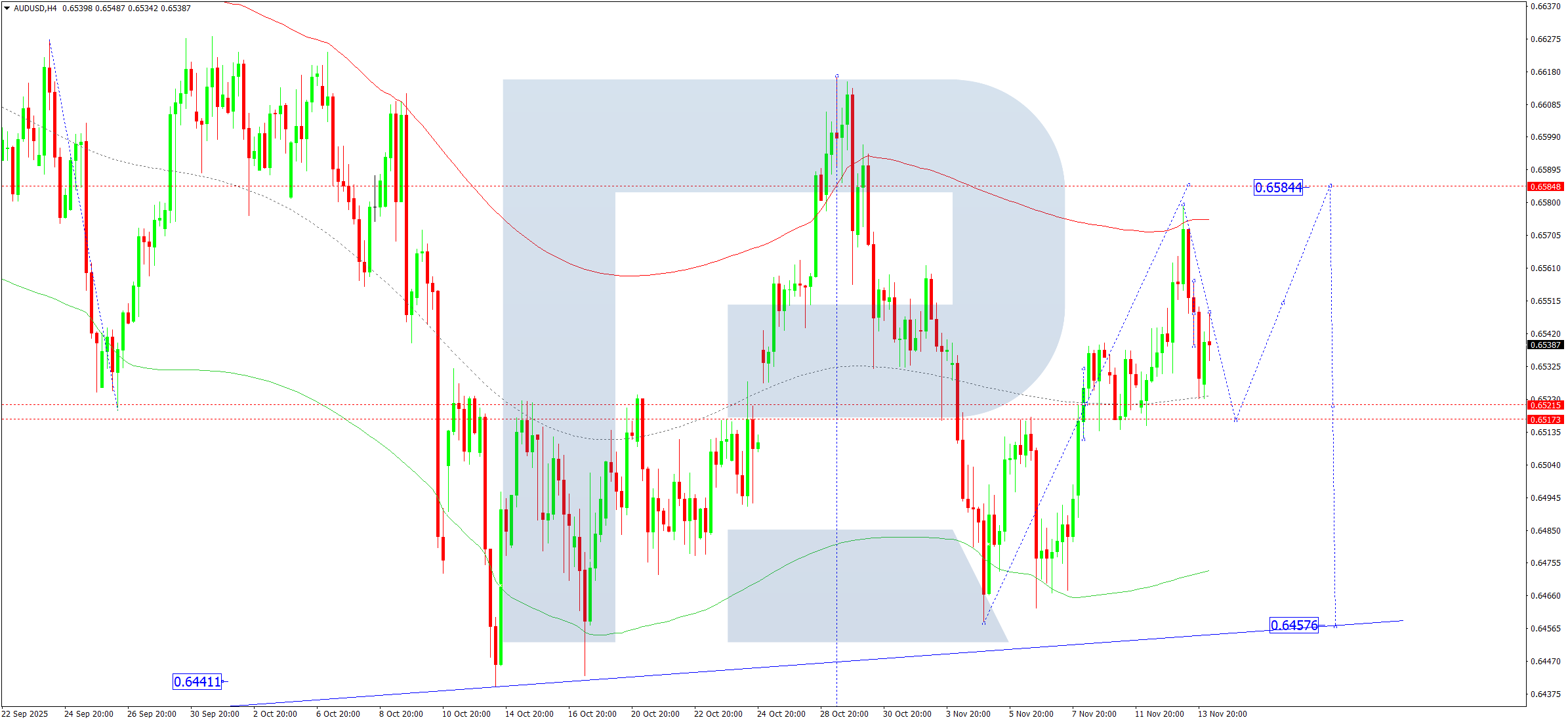 AUDUSD H4 графигінде нарық 0.6579 деңгейіне дейін түзетуді аяқтады. 2025 жылғы 14 қарашада бағаның 0.6515 деңгейіне дейін төмен толқыны басталып, кейін 0.6545 деңгейіне дейін өсуі мүмкін. Нарық іс жүзінде 0.6555 маңайында жаңа шоғырлану диапазонын қалыптастырады. Жоғары бағыттағы бұзылу түзетуді 0.6585 деңгейіне дейін кеңейтуі ықтимал. Төмен бағыттағы бұзылу трендтің 0.6454 деңгейіне дейін жалғасу әлеуетін ашады.