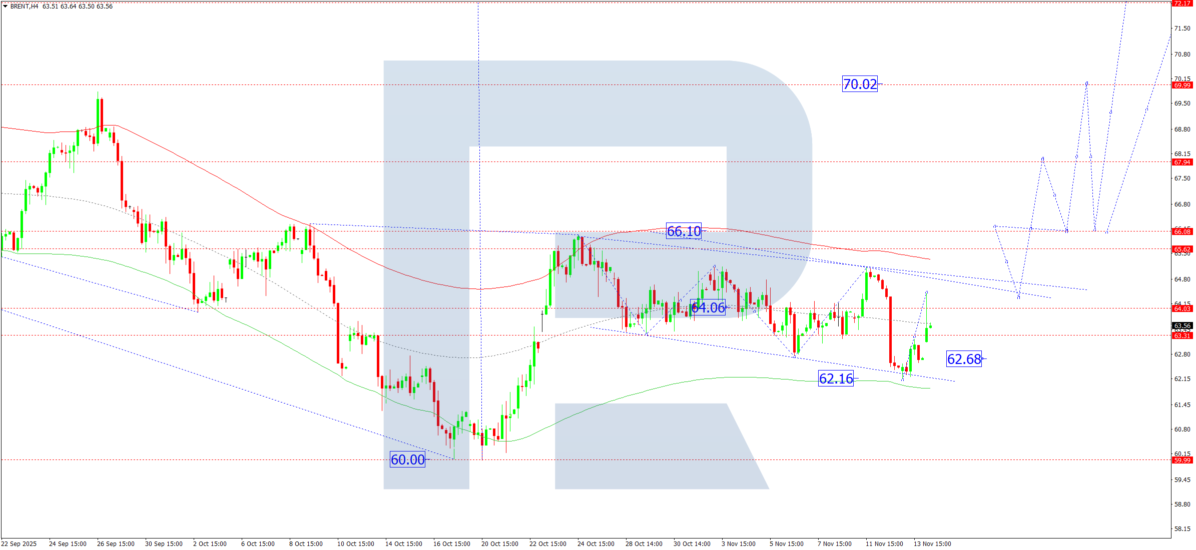 Brent мұнайының H4 графигінде нарық 64.44 деңгейіне дейін жоғары импульсті аяқтады. 2025 жылғы 14 қарашада 63.33 деңгейіне дейін түзету қозғалысы болуы мүмкін. Нарық іс жүзінде жаңа шоғырлану диапазонын қалыптастырады. Жоғары бағыттағы бұзылу 66.10 деңгейіне дейін жоғары толқынның жалғасу әлеуетін ашады. 66.10 деңгейінен жоғары бұзылу трендтің жергілікті мақсат ретінде 70.00 деңгейіне дейін кеңеюін қамтамасыз етеді.