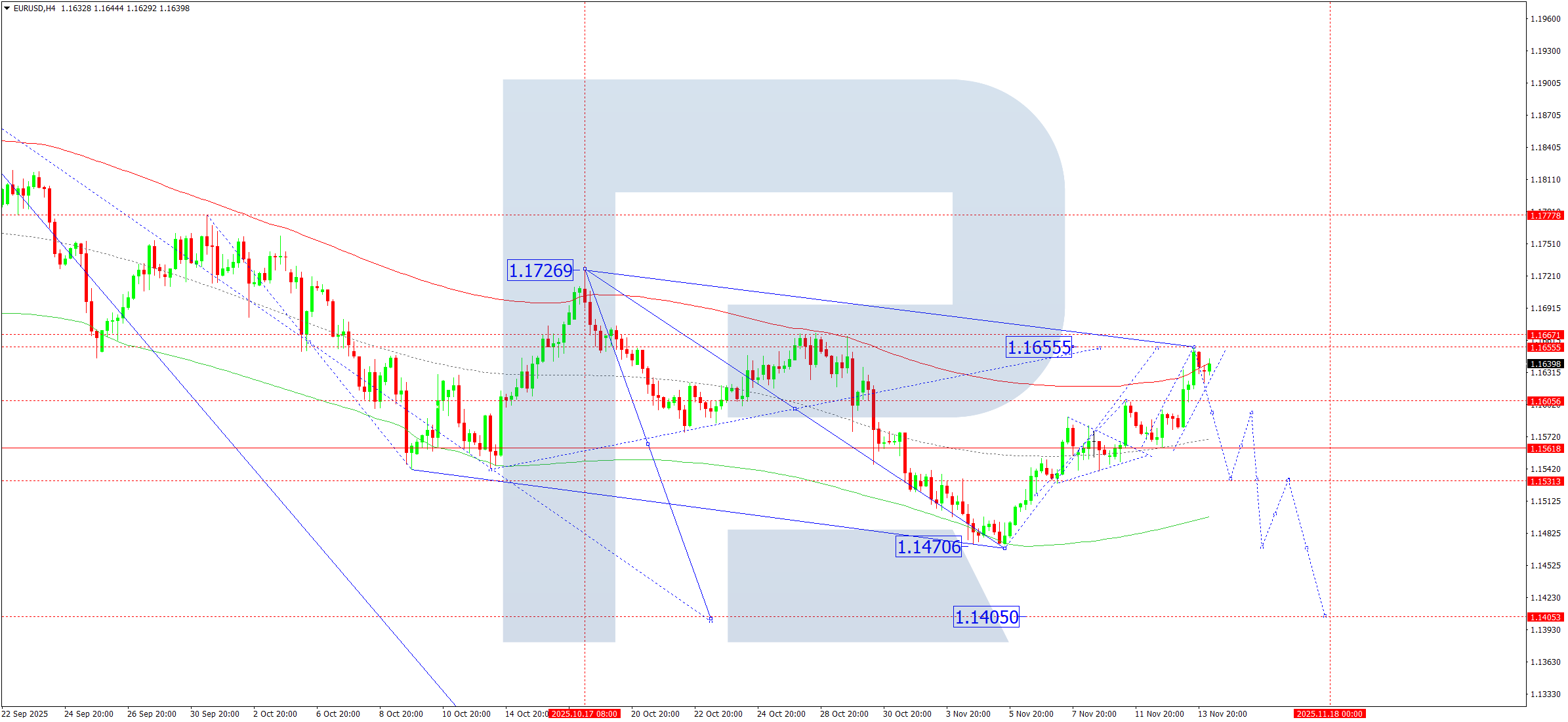 EURUSD H4 графигінде нарық 1.1562 маңайында тар шоғырлану диапазонын қалыптастырып, жоғары бұзылды. 2025 жылғы 14 қарашада 1.1605 деңгейінен қолдау алғаннан кейін нарық 1.1655 деңгейіне дейін тағы бір түзету құрылымын аяқтады. 1.1622 деңгейіне дейін төмен импульс қалыптасып, кейін 1.1644 деңгейіне дейін түзету орын алды. Төмен бағыттағы бұзылу 1.1533 деңгейіне дейін төмендеудің жалғасуына, әрі қарай трендтің 1.1405 деңгейіне дейін кеңеюіне мүмкіндік береді. Егер жоғары бұзылу орын алса, жұп ағымдағы түзету максимумына — 1.1666 деңгейіне дейін көтерілуі мүмкін. Осыдан кейін төмен толқынның 1.1405 деңгейіне қарай басталуы ықтимал.