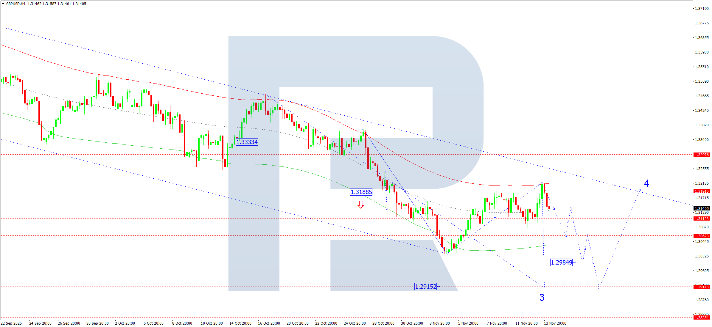 GBPUSD H4 графигінде нарық 1.3215 деңгейіне дейін түзетуді аяқтады. 2025 жылғы 14 қарашада нарық 1.3131 деңгейіне дейін төмен бағыттағы импульс дамытуды жалғастыруда. Осы деңгейден төмен бұзылу келесі мақсатты 1.3065 деңгейінде белгілейді, әрі трендтің 1.2915 деңгейіне дейін кеңею әлеуетін ашады. Мақсат жергілікті және төмендеу трендінің үшінші толқыны аясында орналасқан.