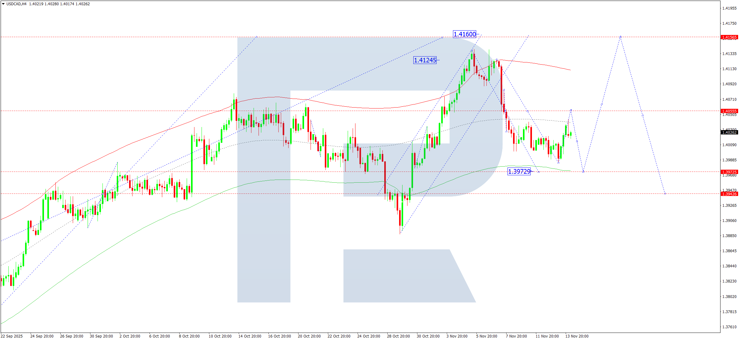 USDCAD H4 графигінде нарық 1.3985 деңгейіне дейін түзетуді аяқтады. 2025 жылғы 14 қарашада баға 1.4055 деңгейіне дейін өсу қозғалысын қалыптастыруда. Кейін 1.3973 деңгейіне дейін тағы бір төмен толқын мүмкін. Бұл деңгей түзетудің әлеуетін толықтай аяқтайды. Осыдан кейін 1.4160 деңгейіндегі жергілікті мақсатқа дейін жоғары толқынның басталуы күтіледі.