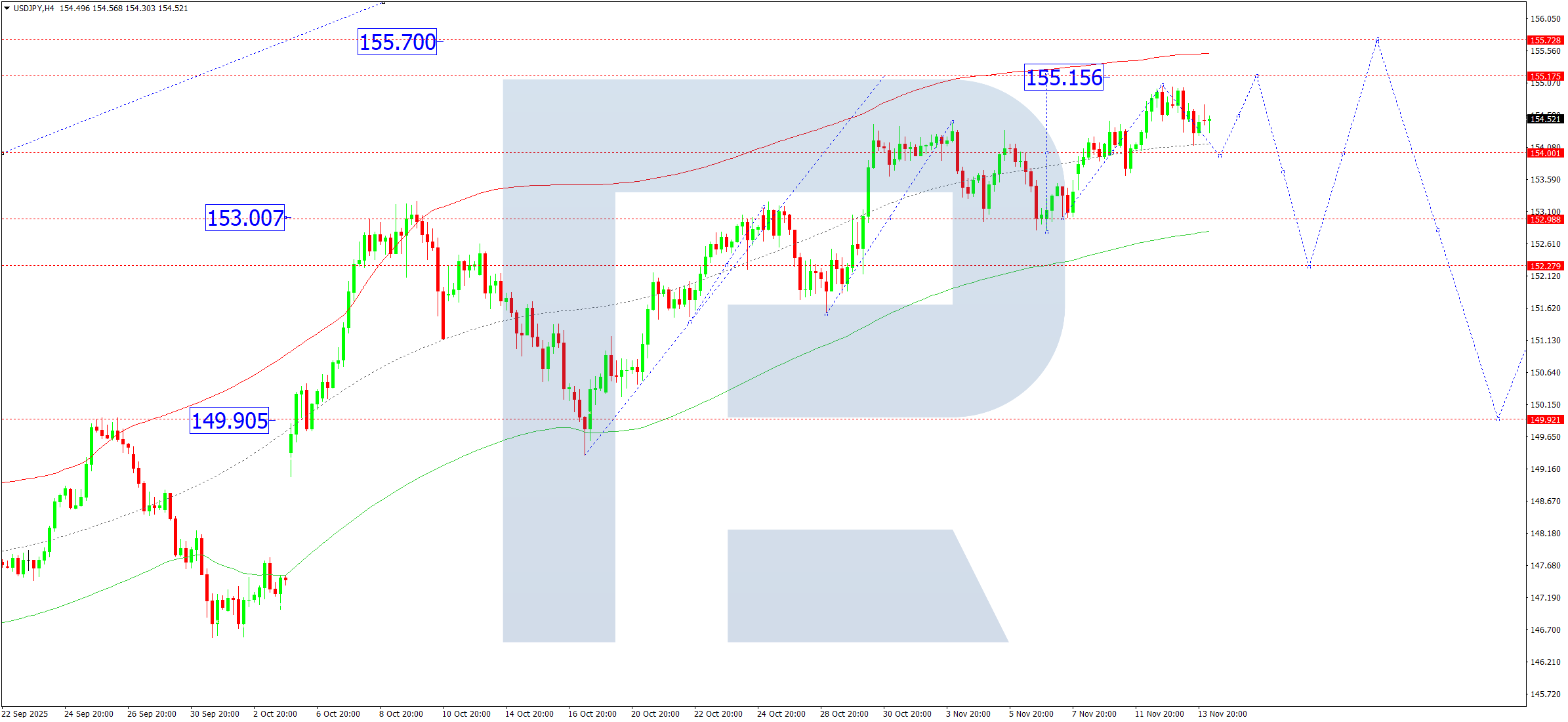 Бүгінгі USDJPY болжамы бойынша техникалық индикаторлар 155.15 деңгейіне дейін өсуді болжайды.