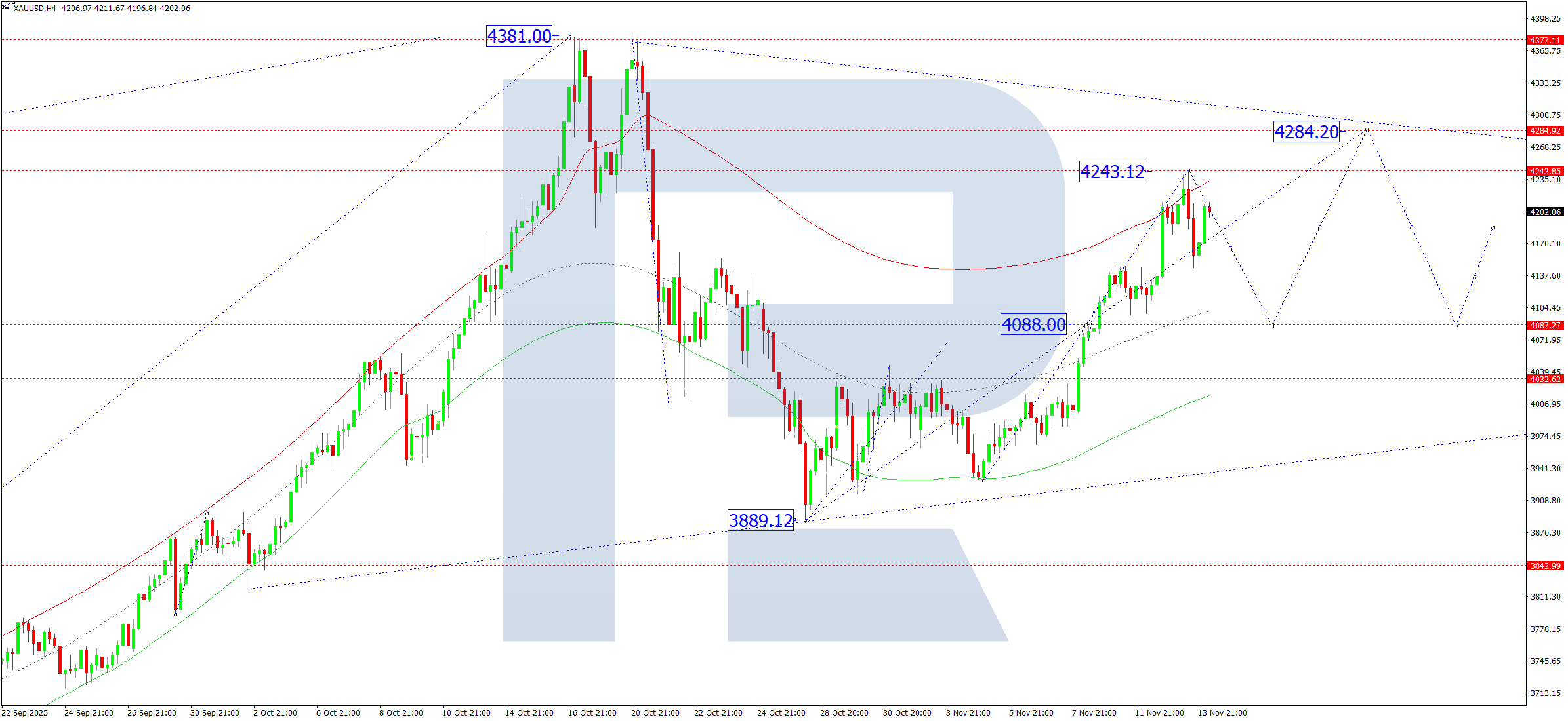 XAUUSD H4 графигінде нарық 4,243 деңгейіне дейін өсу толқынын аяқтап, жергілікті мақсатқа жетті. 2025 жылғы 14 қарашада осы деңгейден төмен шоғырлану диапазонының қалыптасуы күтіледі. Төмен бағыттағы бұзылу 4,088 деңгейіне дейін төмендеу әлеуетін ашады. Ал жоғары бағыттағы бұзылу өсу толқынын 4,284 деңгейіне дейін кеңейтуі мүмкін.
