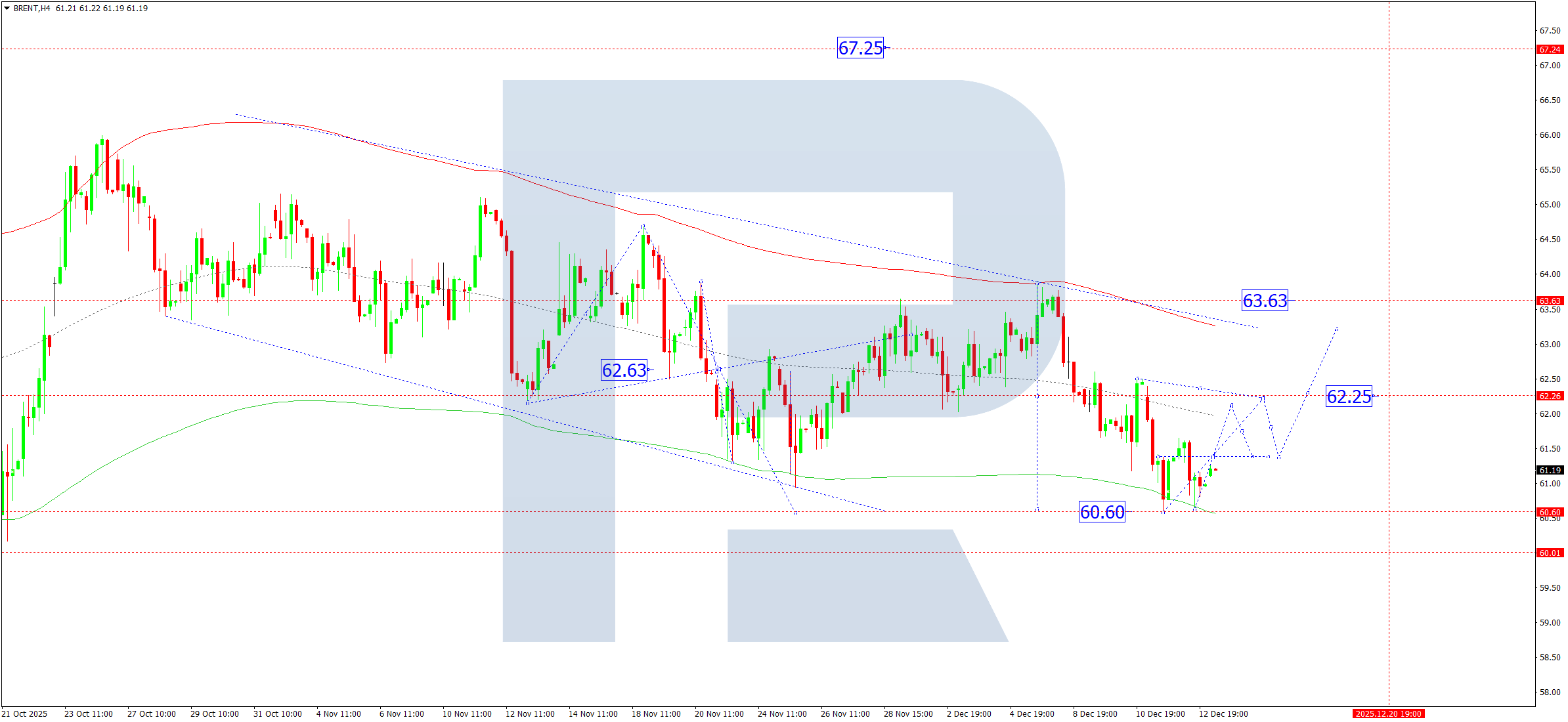 Brent маркалы мұнайдың H4 графигінде нарық 60.60 деңгейіне дейін төмендеу толқынын аяқтады. Бүгін, 15 желтоқсан 2025 жылы, осы деңгейден жоғары жаңа консолидация диапазонының қалыптасуын күтеміз. Егер баға жоғарыға бұзылса, бұл 62.62 деңгейіне дейін өсу толқынының басталу әлеуетін ашады. Осы деңгейден жоғары бұзылу трендтің 63.63 деңгейіне дейін жалғасу мүмкіндігін ашады.