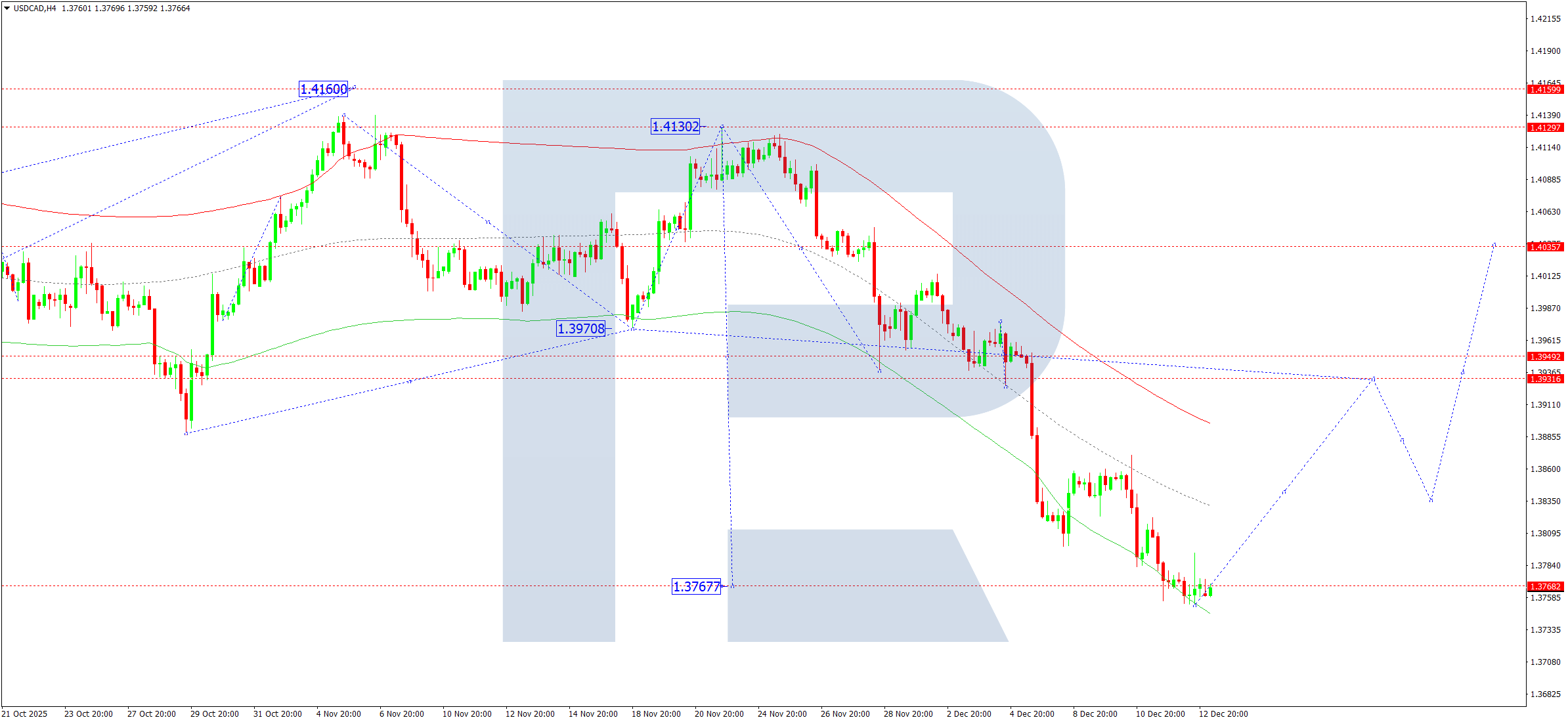 USDCAD жұбының H4 графигінде нарық 1.3767 деңгейіне дейін төмендеу толқынын аяқтады. Бүгін, 15 желтоқсан 2025 жылы, осы деңгейден жоғарыда ықшам консолидация диапазоны қалыптасты. Біз 1.3939 деңгейіне дейін жоғарыға бұзылуды күтеміз. Кейінірек түзетудің 1.3844 деңгейіне дейін созылу ықтималдығын қарастырамыз. Осы түзету аяқталғаннан кейін 1.4040 деңгейіне дейін жаңа өсу толқынының басталуын қарастырамыз. Бұл мақсат жергілікті болып қала береді.