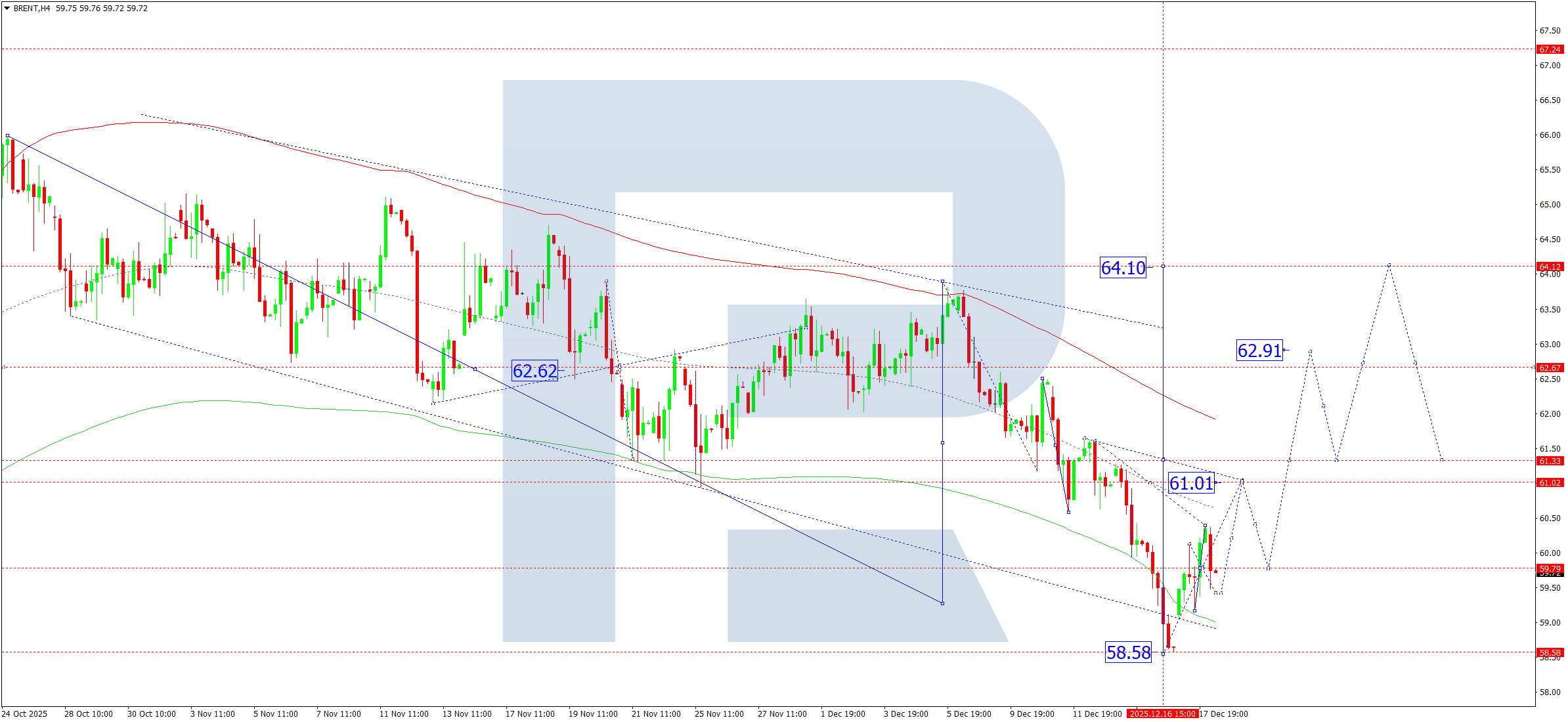 Brent маркалы мұнайдың H4 графигінде нарық 59.79 деңгейі маңында консолидация диапазонын қалыптастыруда. Бүгін, 18 желтоқсан 2025 жылы, 61.00 деңгейіне дейін жоғары импульс күтеміз. Кейінірек 59.80 деңгейіне дейін төмендеу ықтималдығын қарастырамыз. Одан кейін трендтің 64.10 деңгейіне дейін жалғасу перспективасымен 62.90 деңгейіне дейін өсім күтеміз. Бұл бірінші мақсат.