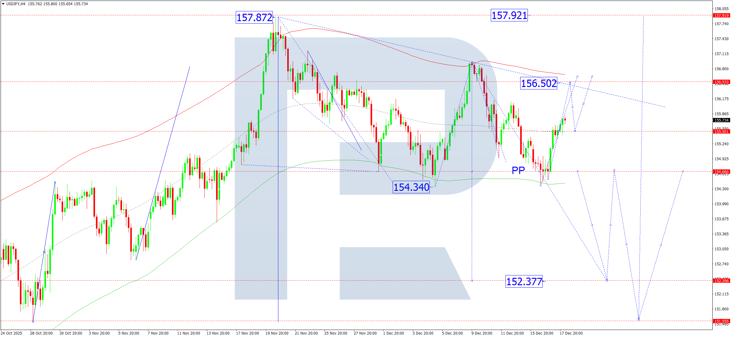 USDJPY жұбының H4 графигінде нарық 155.55 деңгейіне дейін өсу толқынын аяқтап, осы деңгей маңында консолидация диапазонын қалыптастырды. Бүгін, 18 желтоқсан 2025 жылы, осы диапазоннан жоғарыға қарай 156.50 деңгейіне дейін бұзылу ықтималдығын қарастырамыз. Кейінірек 155.50 деңгейіне дейін төмендеу ықтималдығын бағалаймыз.