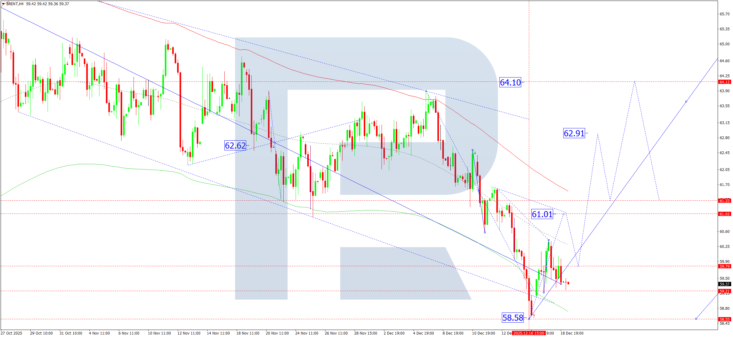 Brent маркалы мұнайдың H4 графигінде нарық 59.79 деңгейі маңында консолидация диапазонын қалыптастыруда. Бүгін, 18 желтоқсан 2025 жылы, 61.00 деңгейіне дейін жоғары импульс күтеміз. Кейінірек 59.80 деңгейіне дейін төмендеу ықтималдығын қарастырамыз. Одан кейін трендтің 64.10 деңгейіне дейін жалғасу перспективасымен 62.90 деңгейіне дейін өсім күтеміз. Бұл бірінші мақсат.