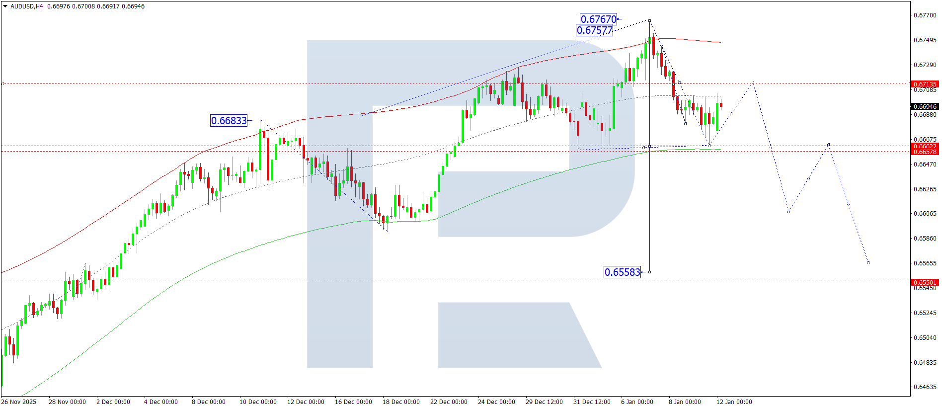 AUDUSD H4 графигінде нарық бірінші мақсат ретінде 0.6660 деңгейіне дейін төмендеу импульсын аяқтады. Бүгін, 12 қаңтар 2026, 0.6713 деңгейіне дейін түзету күтіледі. Бұл — екінші мақсат. Одан кейін үшінші мақсат — 0.6600 деңгейіне дейін одан әрі төмендеу күтіледі.