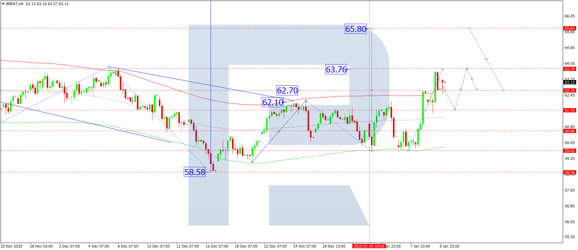 Brent H4 графигінде нарық 63.62 деңгейіне дейін өсуші толқынды аяқтады. Бүгін, 12 қаңтар 2026, бағаның 62.70 деңгейіне дейін түзетілуі және осы деңгейлер маңында консолидация диапазонының қалыптасуы күтіледі. Диапазоннан төмен бұзылу түзетуді 61.70 деңгейіне дейін кеңейтуі мүмкін. Керісінше, диапазоннан жоғары бұзылу 65.88 деңгейіне дейін өсудің әлеуетін ашады.