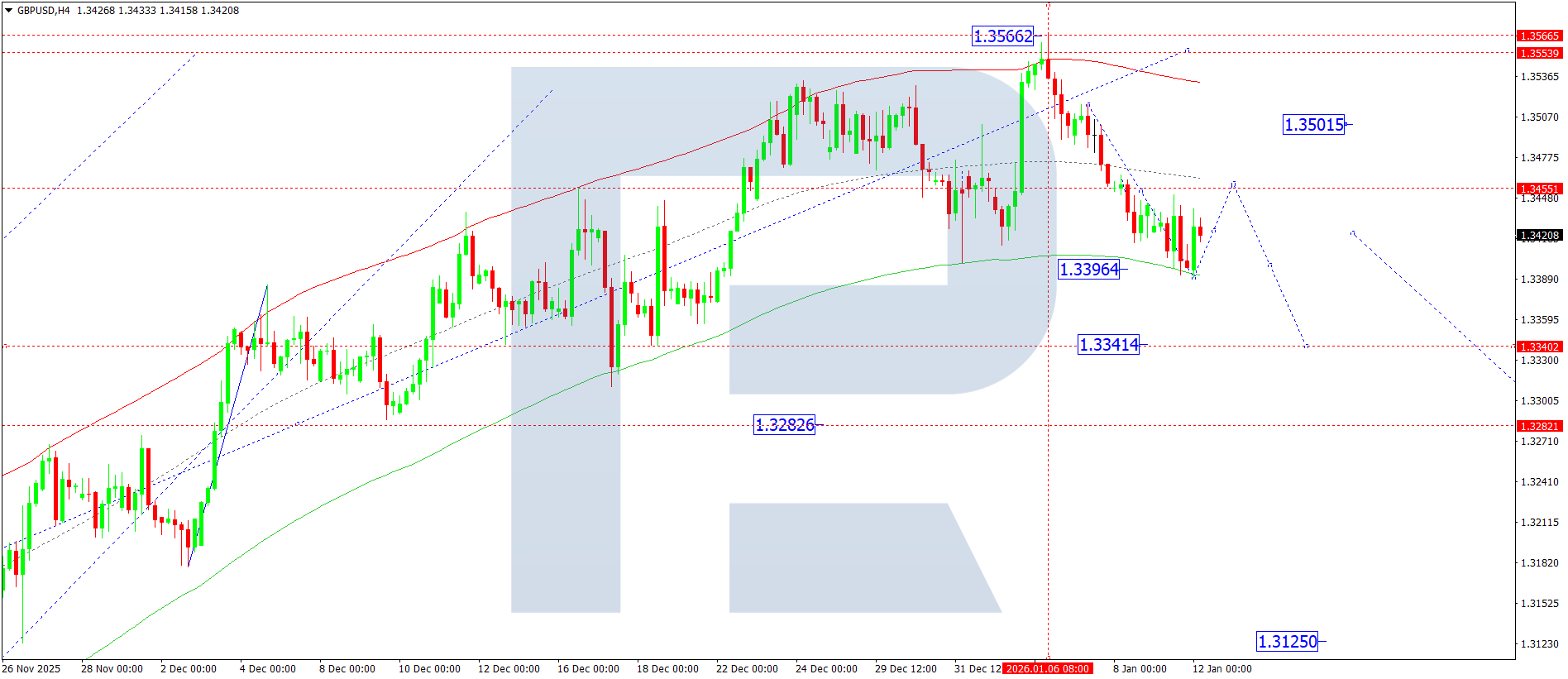 EURUSD H4 графигінде нарық 1.1620 деңгейіне дейін екінші төмендеу импульсын аяқтады. Бүгін, 12 қаңтар 2026, екінші импульстың түзету құрылымы қалыптасуда, мақсат — 1.1682. Осы түзету аяқталғаннан кейін 1.1600 деңгейіне қарай жаңа төмендеу импульсының басталуы күтіледі.