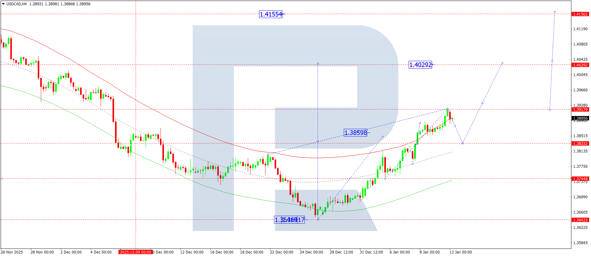 USDCAD H4 графигінде нарық жергілікті мақсат — 1.3917 деңгейіне дейін өсуші толқынды аяқтады. Бүгін, 12 қаңтар 2026, 1.3833 деңгейіне дейін түзетудің басталуы күтіледі. Осы түзету аяқталғаннан кейін бірінші мақсат — 1.4029 деңгейіне қарай жаңа өсуші толқын болуы мүмкін.