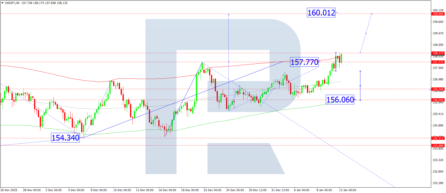 USDJPY H4 графигінде нарық 157.77 деңгейіне жетіп, өсуші толқынды аяқтады. Бүгін, 12 қаңтар 2026, осы деңгей маңында консолидация диапазоны қалыптасуы мүмкін. Диапазоннан жоғары бұзылу 160.00 деңгейіне дейін өсуші толқынның дамуына әлеует ашады. Егер баға диапазоннан төмен қарай шықса, 156.60 деңгейіне дейін түзету қозғалысы мүмкін, одан кейін 160.00 деңгейіне дейін өсу ықтимал.
