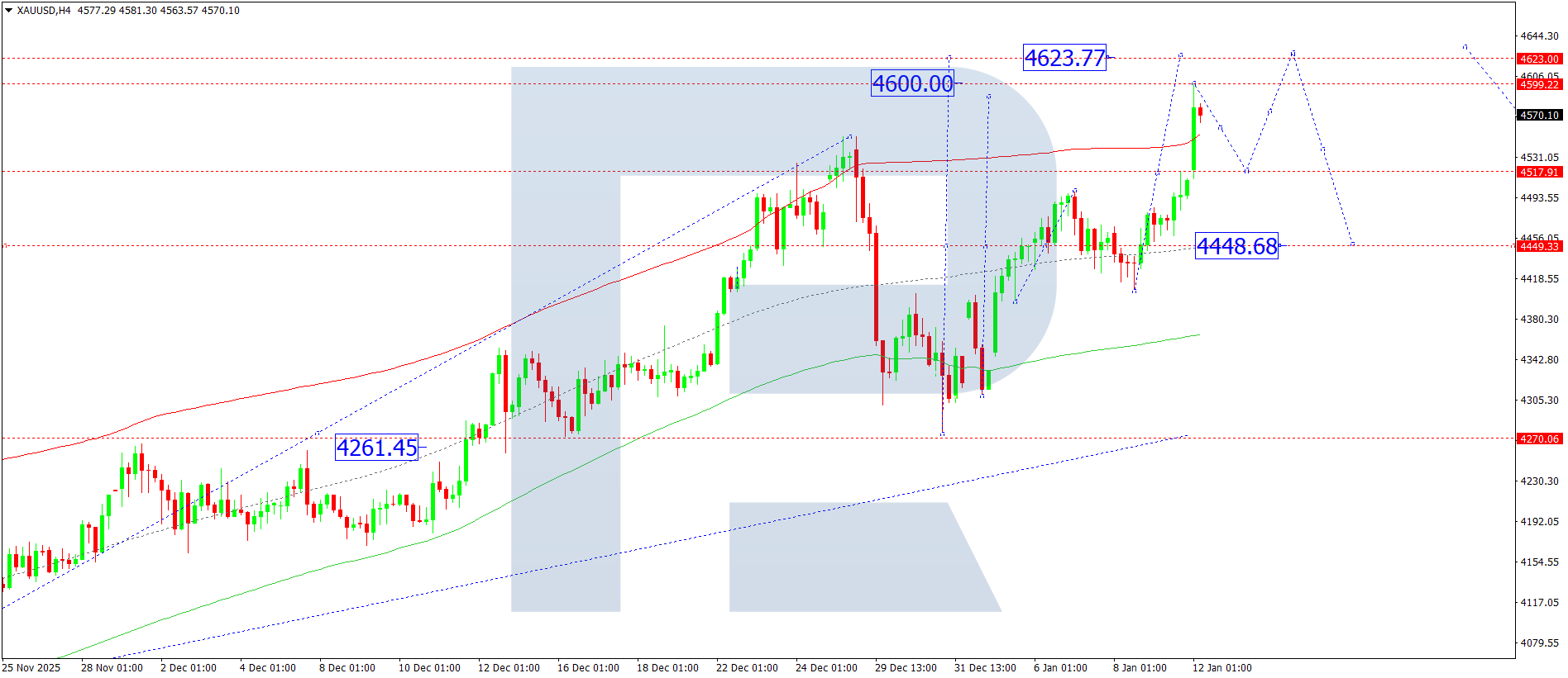 XAUUSD H4 графигінде нарық 4,500 деңгейінен жоғары бұзылды. Бүгін, 12 қаңтар 2026, 4,600 деңгейіне дейін өсуші толқын құрылымы аяқталды. 4,550 деңгейіне дейін түзету (жоғарыдан тест) күтіледі, одан кейін жергілікті мақсат ретінде 4,630 деңгейіне дейін өсу ықтимал.