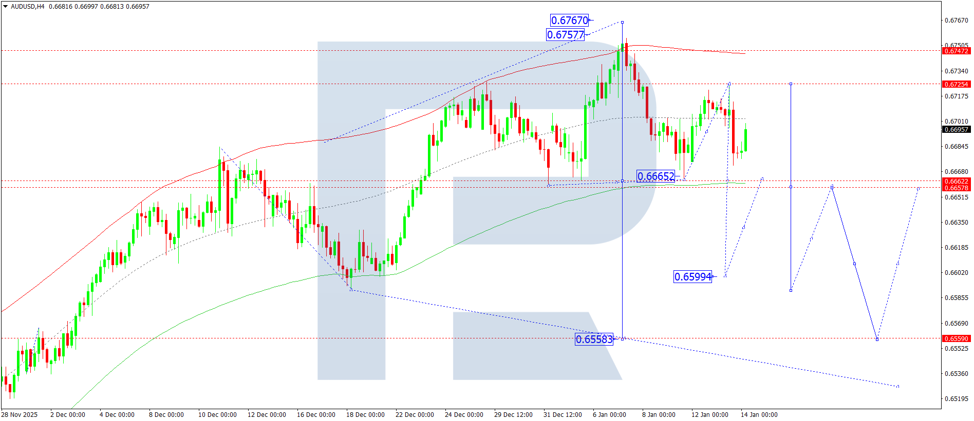AUDUSD H4 графигінде нарық 0.6700 деңгейі маңында консолидация диапазонын қалыптастыруда. Бүгін, 14 қаңтар 2026, 0.6733 деңгейіне дейін өсуші қозғалыс күтіледі. Одан кейін 0.6600 деңгейіне қарай төмендеу, әрі қарай трендтің 0.6560 деңгейіне дейін жалғасу ықтималдығы қарастырылады.