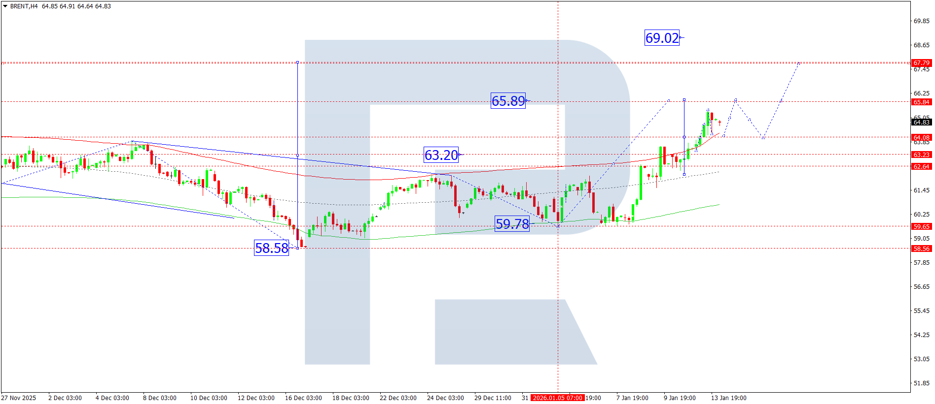 Brent H4 графигінде нарық 65.84 деңгейіне қарай өсуші толқынды қалыптастыруда. Бүгін, 14 қаңтар 2026, бағаның осы мақсатты деңгейге жетуі күтіледі. Одан кейін котировкалар 64.00 деңгейіне дейін түзетіліп, осы деңгейлер маңында консолидация диапазонын қалыптастыруы мүмкін. Диапазоннан төмен бұзылу түзетуді 63.00 деңгейіне дейін кеңейтуі ықтимал. Керісінше, жоғары бағыттағы бұзылу 69.00 деңгейіне дейін өсуші толқынның әлеуетін ашады.