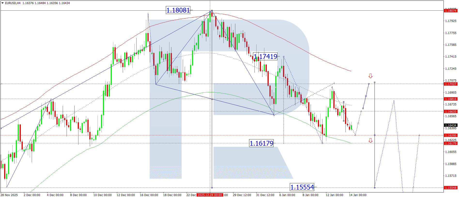 EURUSD H4 графигінде нарық 1.1665 деңгейі маңында консолидация диапазонын қалыптастырды және төменгі шекараны бұзғаннан кейін 1.1629 деңгейіне қарай төмендеу толқынын дамытуды жалғастыруда. Бүгін, 14 қаңтар 2026, жұптың осы мақсатты деңгейге жетуі күтіледі. Одан кейін 1.1665 деңгейіне қарай тағы бір өсуші қозғалыс мүмкін. Егер бұл деңгей жоғары бағытта бұзылса, 1.1700 деңгейіне дейін өсу жалғасуы ықтимал. Осы нүктеде түзету әлеуеті толық таусылады. Түзету аяқталғаннан кейін 1.1555 деңгейіне қарай жаңа төмендеу импульсы күтіледі. Бұл — бірінші мақсат.