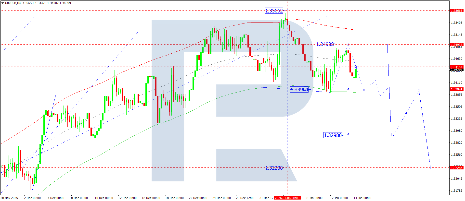 GBPUSD H4 графигінде нарық 1.3393 деңгейіне қарай төмендеу толқынын дамытуды жалғастыруда. Бүгін, 14 қаңтар 2026, жұптың осы мақсатты деңгейге жетуі күтіледі. Одан кейін 1.3494 деңгейіне дейін өсу күтіледі. Осы нүктеде түзету әлеуеті толық таусылады. Бұдан кейін жергілікті мақсат ретінде 1.3300 деңгейіне қарай төмендеу толқынының басталуын қарастыру орынды.