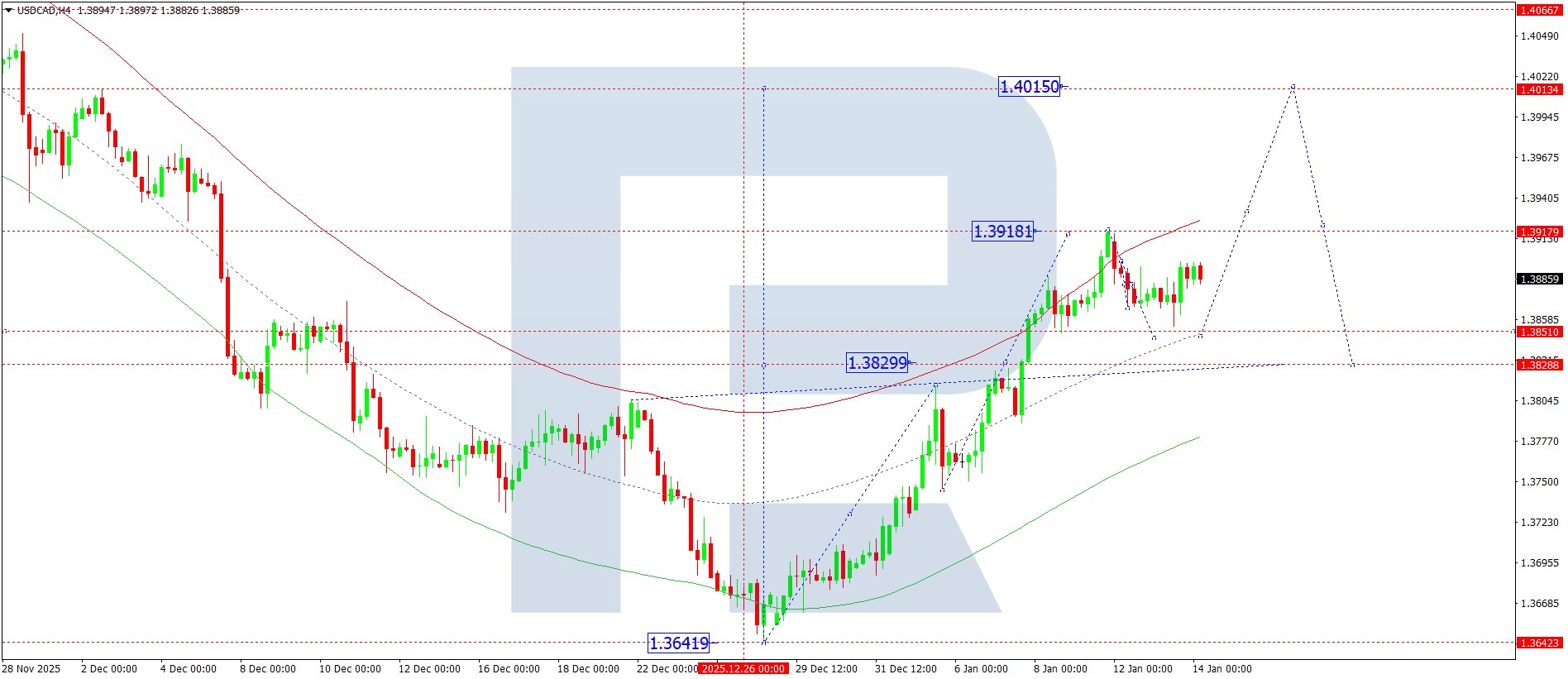 USDCAD H4 графигінде нарық 1.3883 деңгейі маңында консолидация диапазонын қалыптастыруда. Бүгін, 14 қаңтар 2026, 1.3850 деңгейіне дейін төмендеу күтіледі. Осы түзету аяқталғаннан кейін бірінші мақсат ретінде 1.4010 деңгейіне қарай жаңа өсуші толқын басталуы мүмкін.