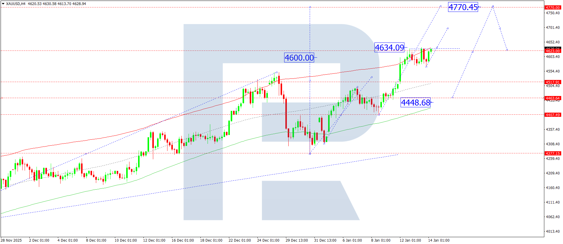 XAUUSD H4 графигінде нарық 4,644 деңгейінен жоғары бұзылып, 4,770 деңгейіне қарай өсуші толқынды жалғастыруда. Бүгін, 14 қаңтар 2026, осы мақсатты деңгейге жету күтіледі. Бұл — жергілікті мақсат. Одан кейін 4,633 деңгейіне дейін түзетудің басталуы мүмкін.