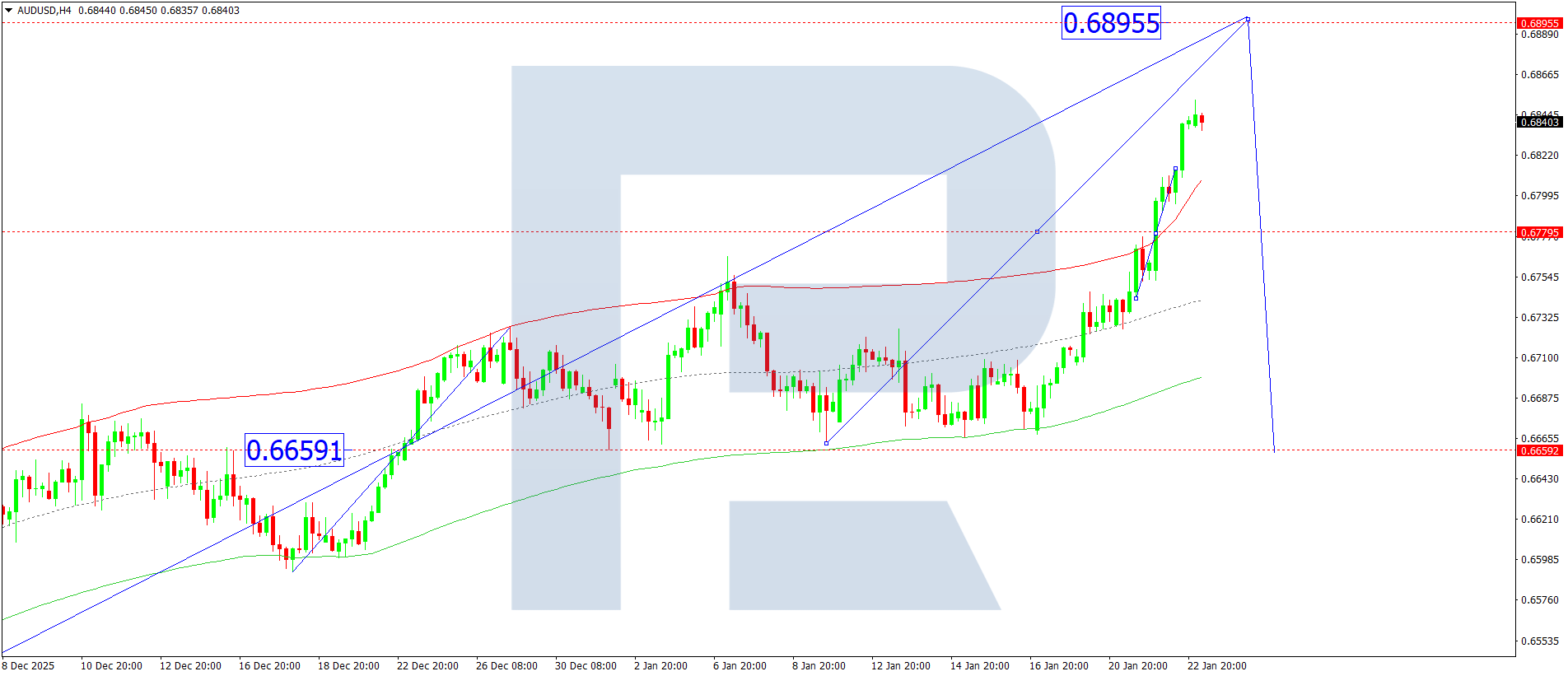 AUDUSD H4 графигінде нарық 0.6890 деңгейіне қарай өсуді жалғастыруда. Бүгін, 23 қаңтар 2026, жұптың осы мақсатты деңгейге жетуі күтіледі. Одан кейін 0.6777 деңгейіне қарай төмендейтін толқын басталуы мүмкін. Бұдан әрі 0.6900 деңгейіне қарай өсу ықтимал.