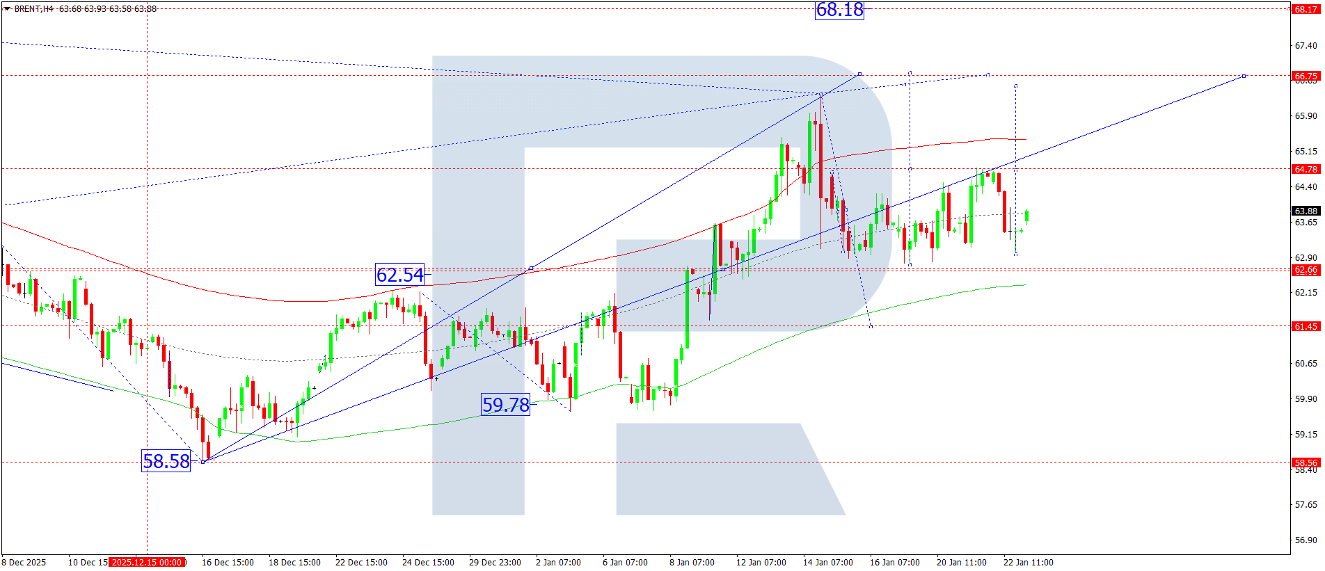 Brent H4 графигінде нарық 63.80 деңгейі маңында консолидация диапазонын қалыптастыруда. Бүгін, 23 қаңтар 2026, 64.70 деңгейіне қарай өсуші толқын мүмкін. Егер бұл деңгей жоғары бағытта бұзылса, 66.75 деңгейіне қарай толқынның жалғасуына жол ашылады.