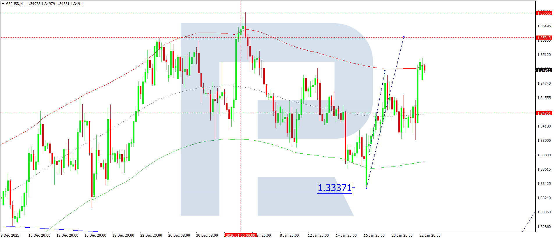 GBPUSD H4 графигінде нарық 1.3490 деңгейі маңында консолидация диапазонын қалыптастыруда. Бүгін, 23 қаңтар 2026, 1.3535 деңгейіне қарай өсуші толқын күтіледі. Егер бұл деңгей жоғары бағытта бұзылса, 1.3560 деңгейіне қарай толқынның дамуына әлеует ашылады.