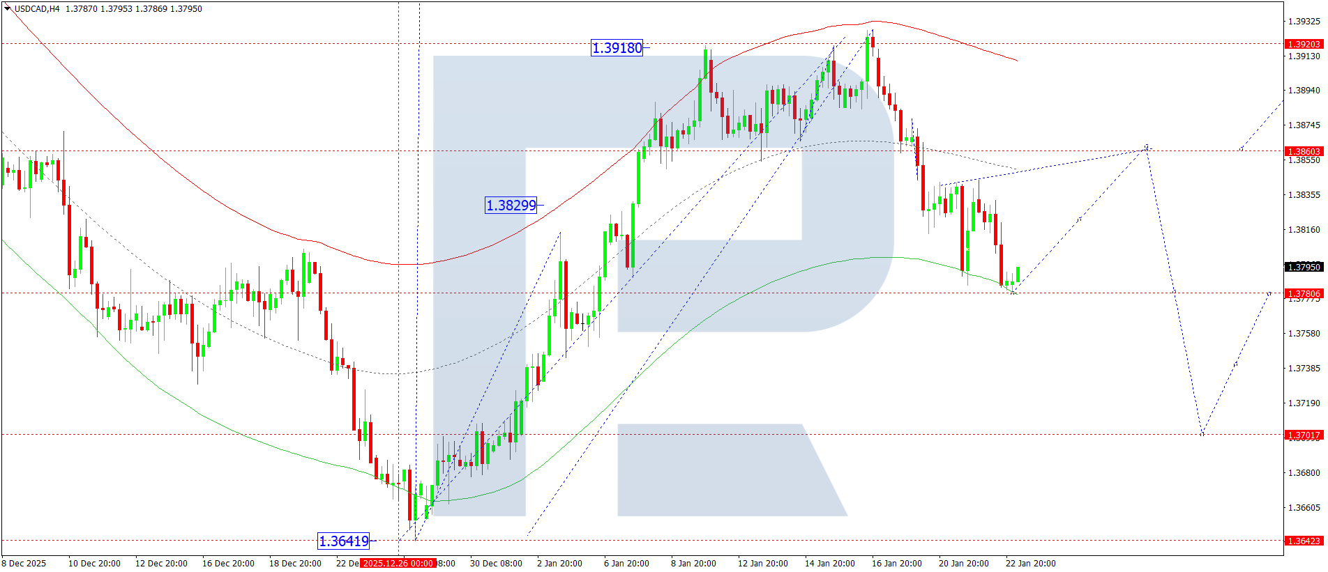 USDCAD H4 графигінде нарық 1.3780 деңгейіне дейін төмендейтін толқынды аяқтады. Бүгін, 23 қаңтар 2026, 1.3860 деңгейіне қарай өсуші толқын күтіледі. Одан әрі жұптың 1.3700 деңгейіне дейін төмендеуі мүмкін.