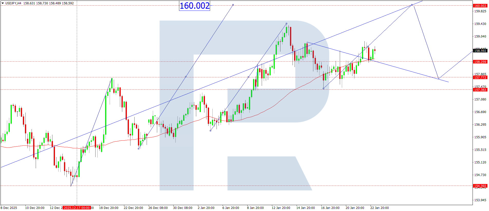 USDJPY H4 графигінде нарық 158.51 деңгейі маңында консолидация диапазонын дамытуды жалғастыруда. Бүгін, 23 қаңтар 2026, диапазоннан жоғары бағытта бұзылу 160.00 деңгейіне қарай толқынның дамуына жол ашуы мүмкін. Керісінше, диапазоннан төмен бағытта бұзылу 157.77 деңгейіне қарай толқынның басталуына әкелуі ықтимал.