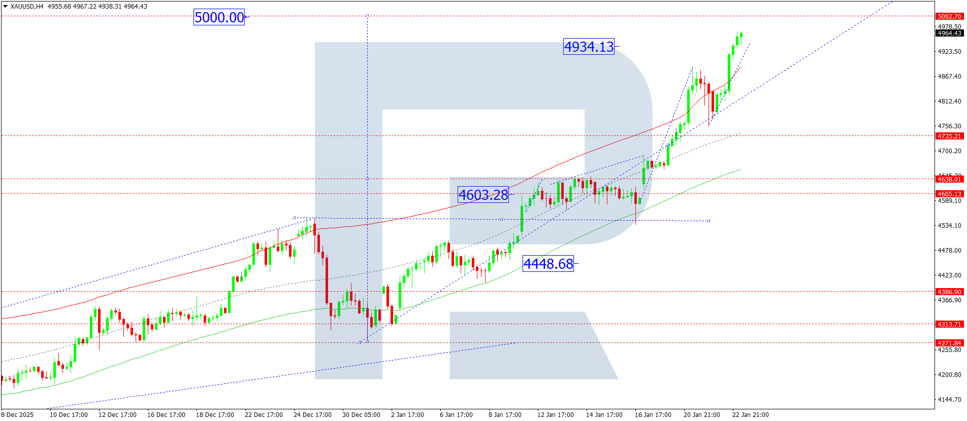 XAUUSD H4 графигінде нарық 5,000 деңгейіне қарай өсуші толқын қалыптастыруда. Бүгін, 23 қаңтар 2026, бағаның осы мақсатты деңгейге жетуі күтіледі. Одан кейін 4,800 деңгейіне қарай түзету мүмкін, әрі одан соң 4,900 деңгейіне қарай өсу ықтимал.