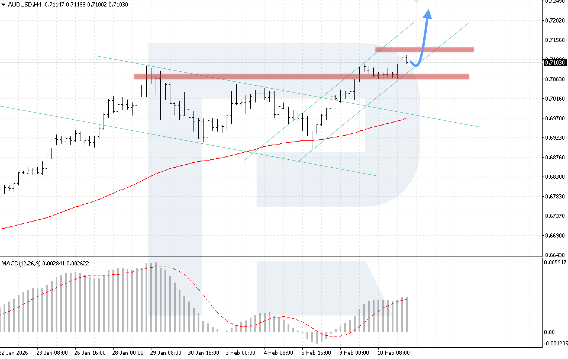 AUDUSD жұбының H4 графигінде нарық қарсылықты бұзғаннан кейін түзету көрсетуде, алайда баға өсуші арна ішінде қалуда. Бүгін, 11 ақпан 2026, негізгі сценарий арна шекарасынан кері серпілгеннен кейін 0.7215 деңгейін мақсат еткен бычий импульстің жалғасуын қарастырады.