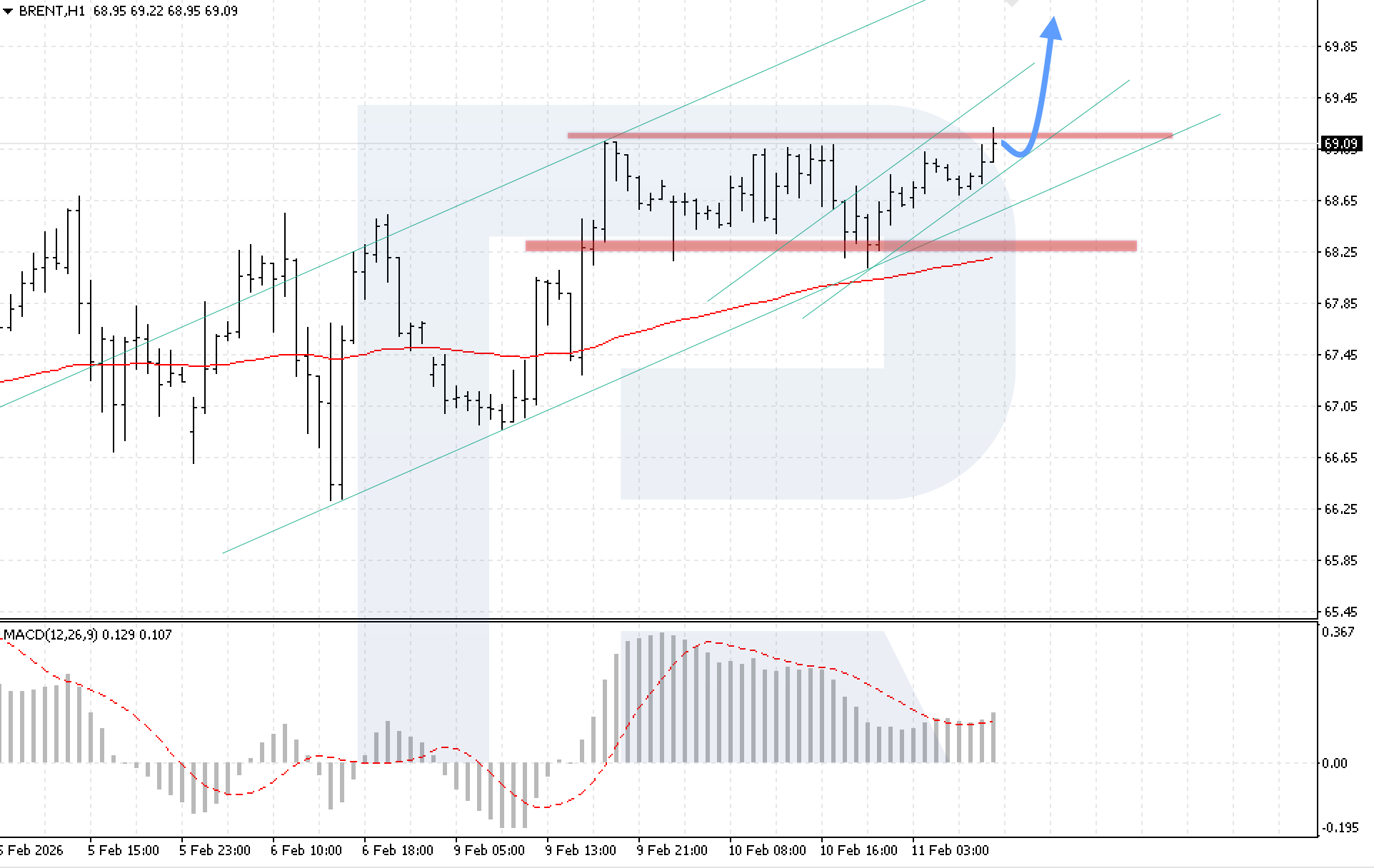 Техникалық көрініс бычий сценарийді растайды. MACD индикаторы гистограмманың өсуін және сигнал сызығынан жоғары бұзылуды көрсетіп, сатып алу импульсінің күшейгенін білдіреді. Өсуді іске асырудың негізгі шарты — бағаның 69.10 деңгейінен жоғары бекітілуі, бұл түзету арнасының жоғарғы шекарасынан жоғары бұзылуды растайды.