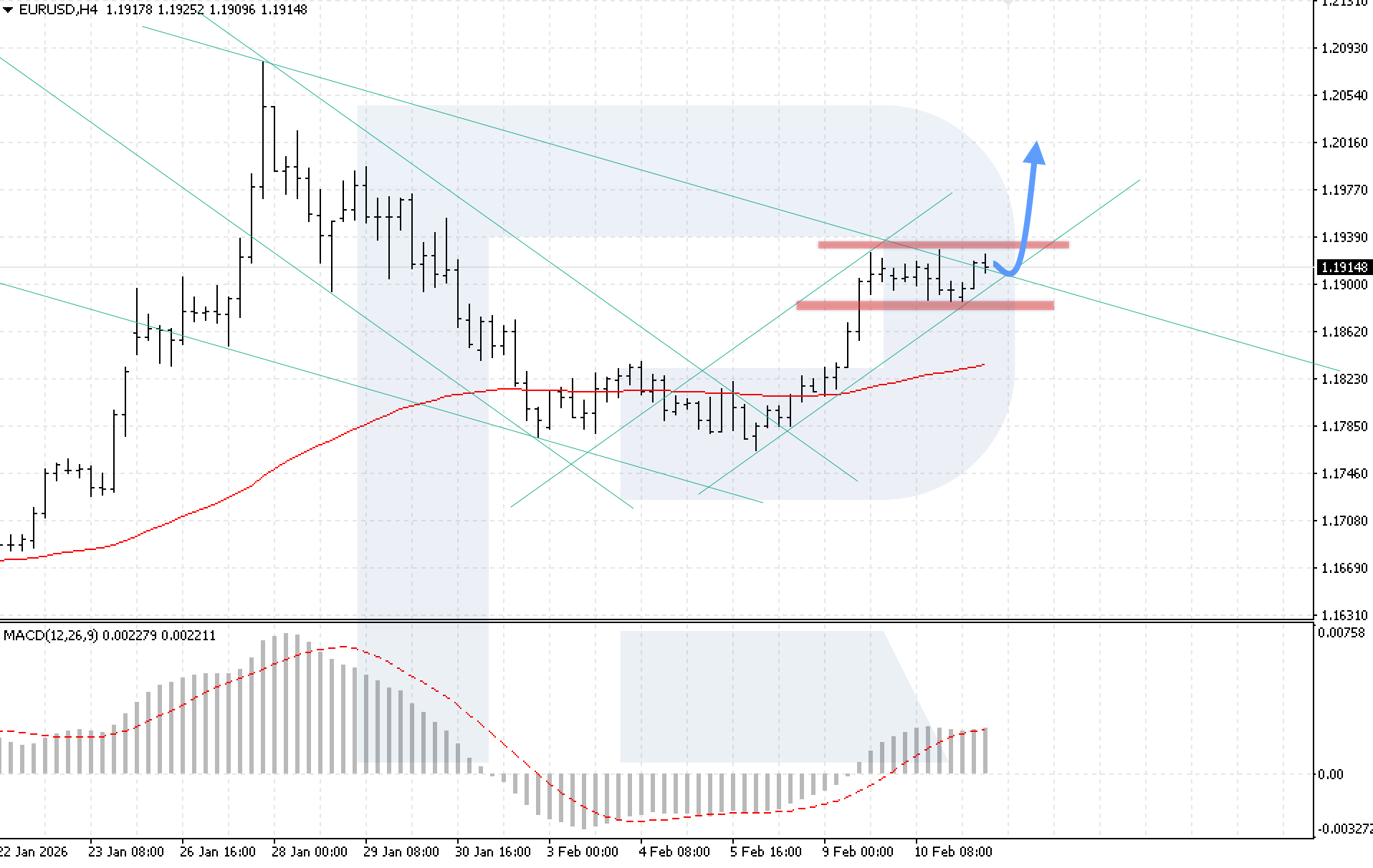 EURUSD жұбының H4 графигінде нарық консолидация фазасында қозғалып жатыр. Сатып алушылар ұзақмерзімді төмендеуші арнаның жоғарғы шекарасынан жоғары бекінуге тырысуда. Бүгін, 11 ақпан 2026, негізгі сценарий 1.1905 аймағындағы арна шекарасынан кері серпіліп, 1.2015 деңгейіне қарай өсуші толқынның дамуын болжайды.