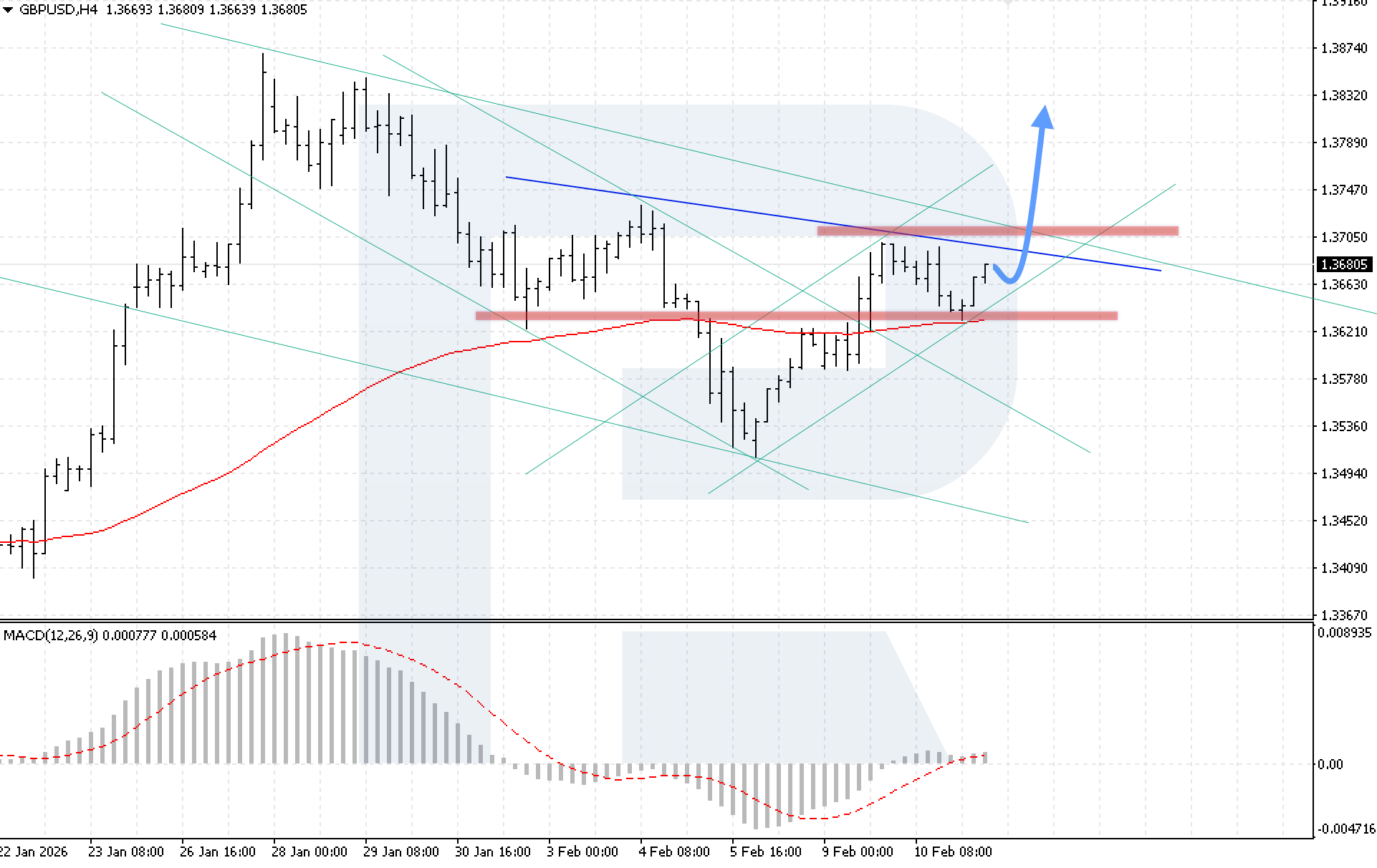 Техникалық көрініс бұл сценарийді растайды. MACD индикаторы қысқа үзілістен кейін өсуді көрсетіп, бычий импульстің күшін білдіреді. Өсудің жалғасуы үшін негізгі шарт — бағаның 1.3725 деңгейінен жоғары бекітілуі. Бұл сатып алушылар белсенділігін растап, Head and Shoulders үлгісінің жоғарғы шекарасынан жоғары бұзылуды білдіреді.