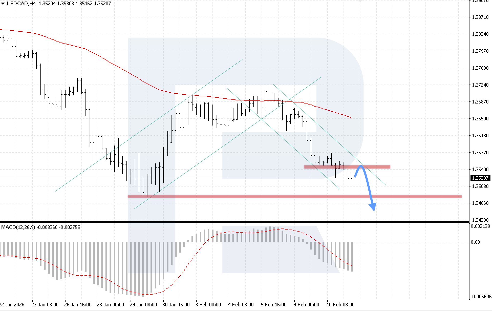 USDCAD жұбының H4 графигінде нарық күшті аюлы импульс аясында белсенді құлдырауын жалғастыруда. Бүгін, 11 ақпан 2026, негізгі сценарий 1.3535 қарсылық деңгейінен кері серпілгеннен кейін 1.3455 деңгейін мақсат еткен төмендеудің жалғасуын қарастырады.