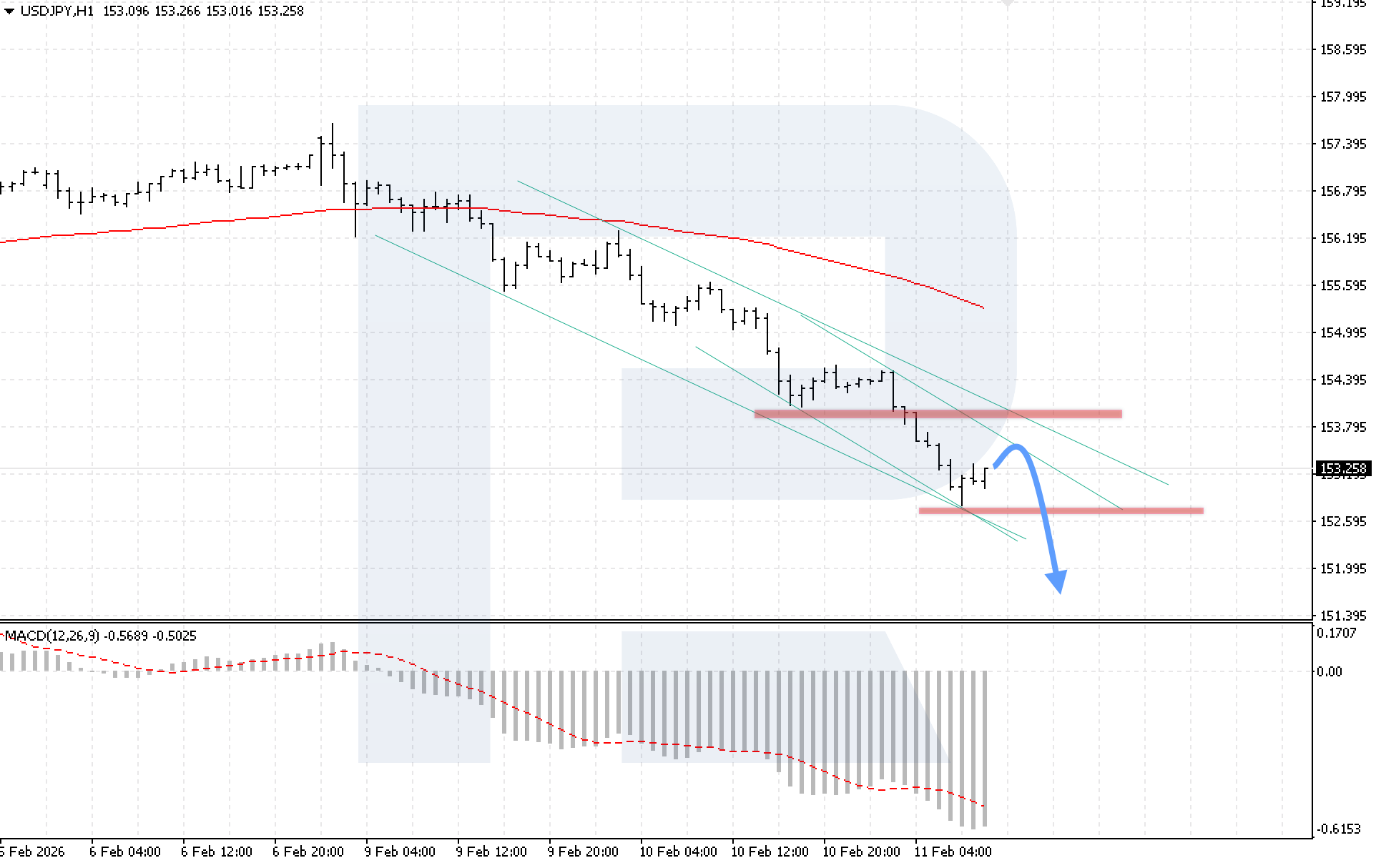 USDJPY жұбының H4 графигінде нарық төмендеуші арна аясында белсенді құлдырауды көрсетуде. Ең жақын қолдау аймағы 152.60 деңгейінде орналасқан. Бүгін, 11 ақпан 2026, негізгі сценарий жұптың 151.65 деңгейін мақсат етіп төмендеуін жалғастыруын қарастырады.