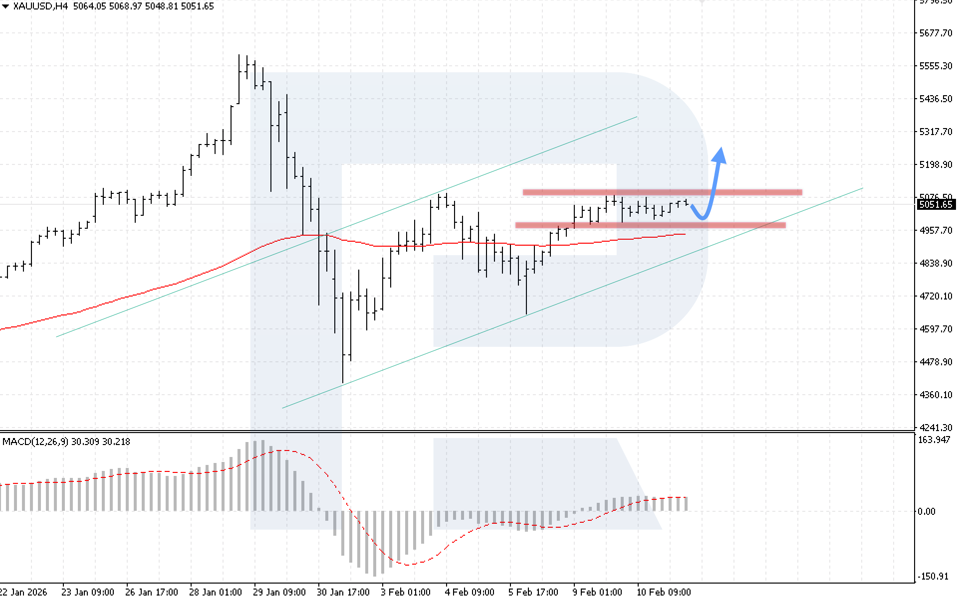 XAUUSD жұбының H4 графигінде нарық 5,075 деңгейіндегі қарсылықты белсенді түрде тестілеуді жалғастыруда, бұл бычий қысымның күшейіп жатқанын көрсетеді. Бүгін, 11 ақпан 2026, негізгі сценарий 4,960 қолдау деңгейінен кері серпіліп, 4,845 деңгейіне қарай өсуді жалғастыруды қарастырады.