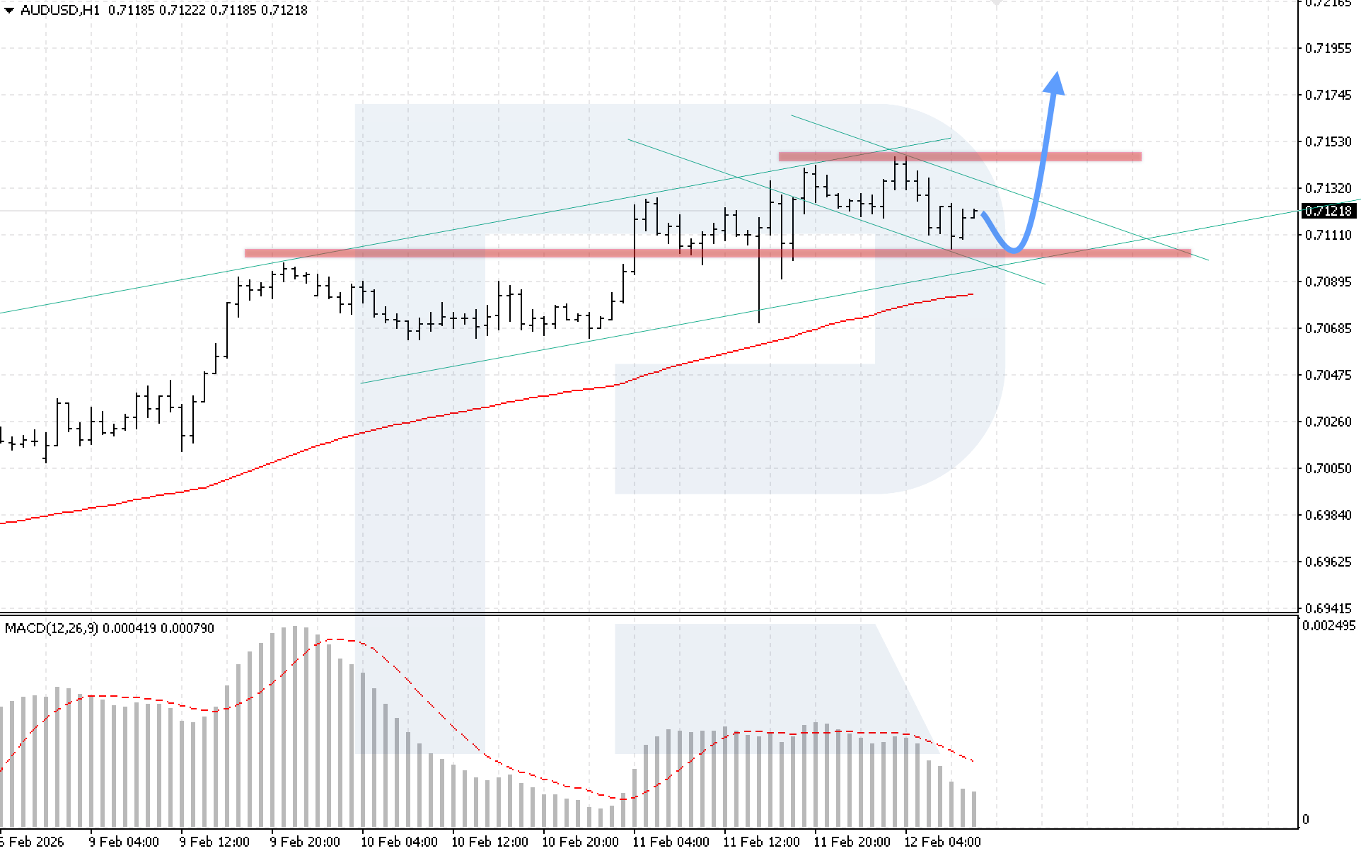AUDUSD жұбының H4 графигінде нарық түзетуін жалғастыруда, алайда баға EMA-85 сызығынан жоғары қалып, бычий қысымның сақталғанын көрсетеді. Бүгін, 12 ақпан 2026, негізгі сценарий арнаның төменгі шекарасынан кері серпіліп, 0.7185 деңгейін мақсат еткен бычий импульстің жалғасуын қарастырады.