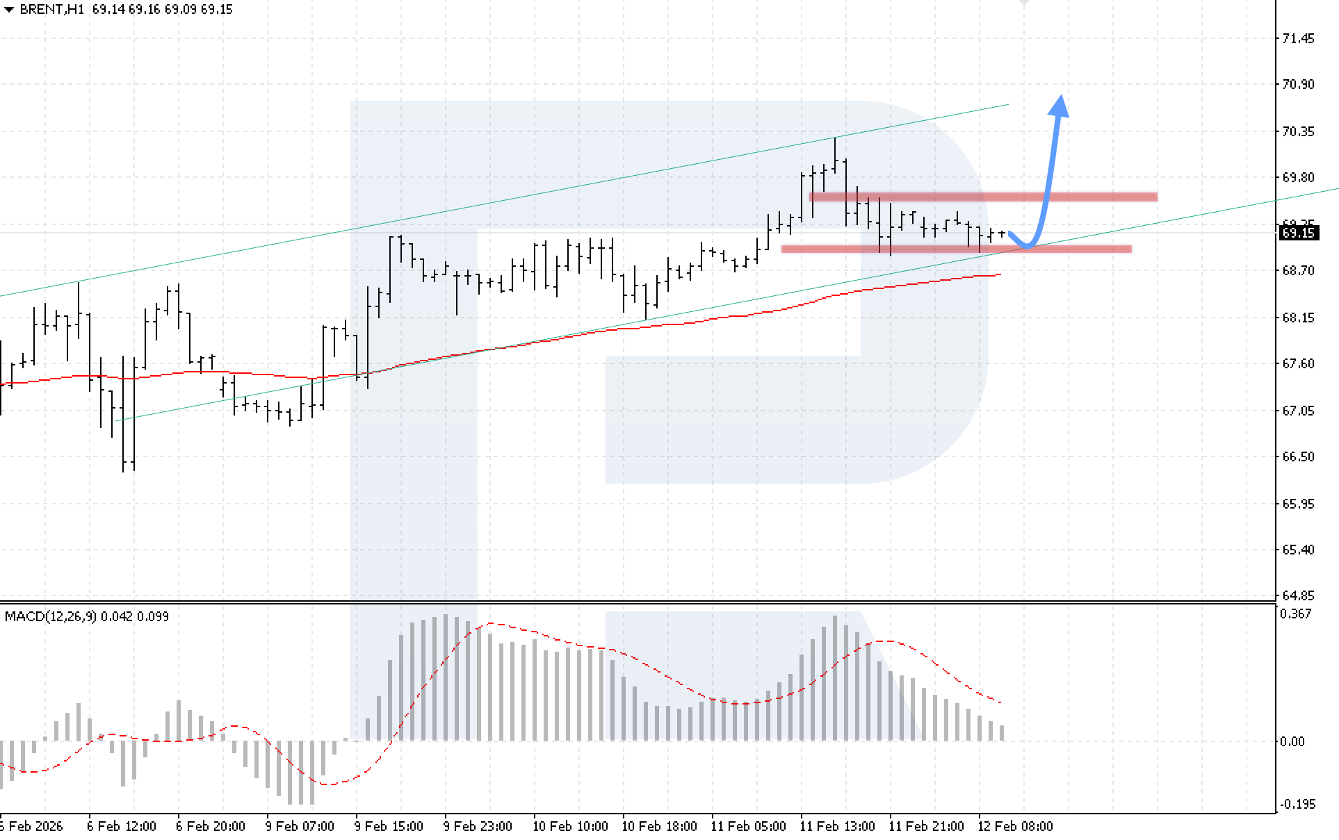 Техникалық көрініс бычий сценарийді растайды. MACD индикаторы гистограмма төмендеуінің баяулағанын көрсетуде. Өсуді іске асырудың негізгі шарты — бағаның 69.10 деңгейінен жоғары бекітілуі, бұл Double Bottom үлгісінің жоғарғы шекарасынан жоғары бұзылуды және жоғары мақсаттарға бағытталған қозғалыстың басталуын білдіреді.