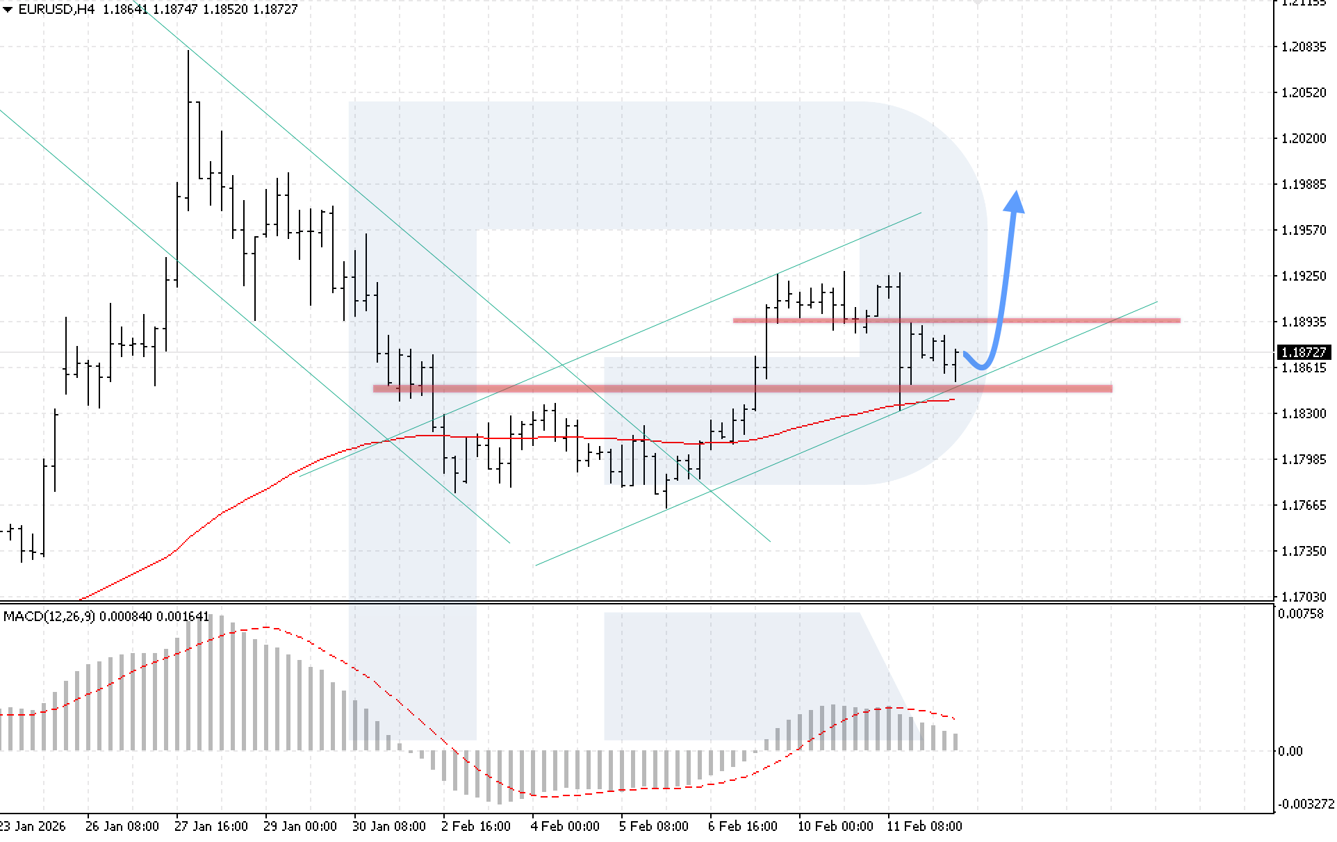 Техникалық көрініс бұл сценарийді растайды. MACD индикаторы гистограмма төмендеуінің баяулағанын көрсетуде, ал баға 1.1840 қолдау деңгейін екі рет тестіледі, бұл Double Bottom кері бұрылу үлгісінің қалыптасуын білдіруі мүмкін. Өсудің жалғасуы үшін негізгі шарт — бағаның 1.1905 деңгейінен жоғары сенімді бекітілуі, бұл үлгінің жоғарғы шекарасынан жоғары бұзылуды және бычий қозғалыстың қайта жандануын растайды.