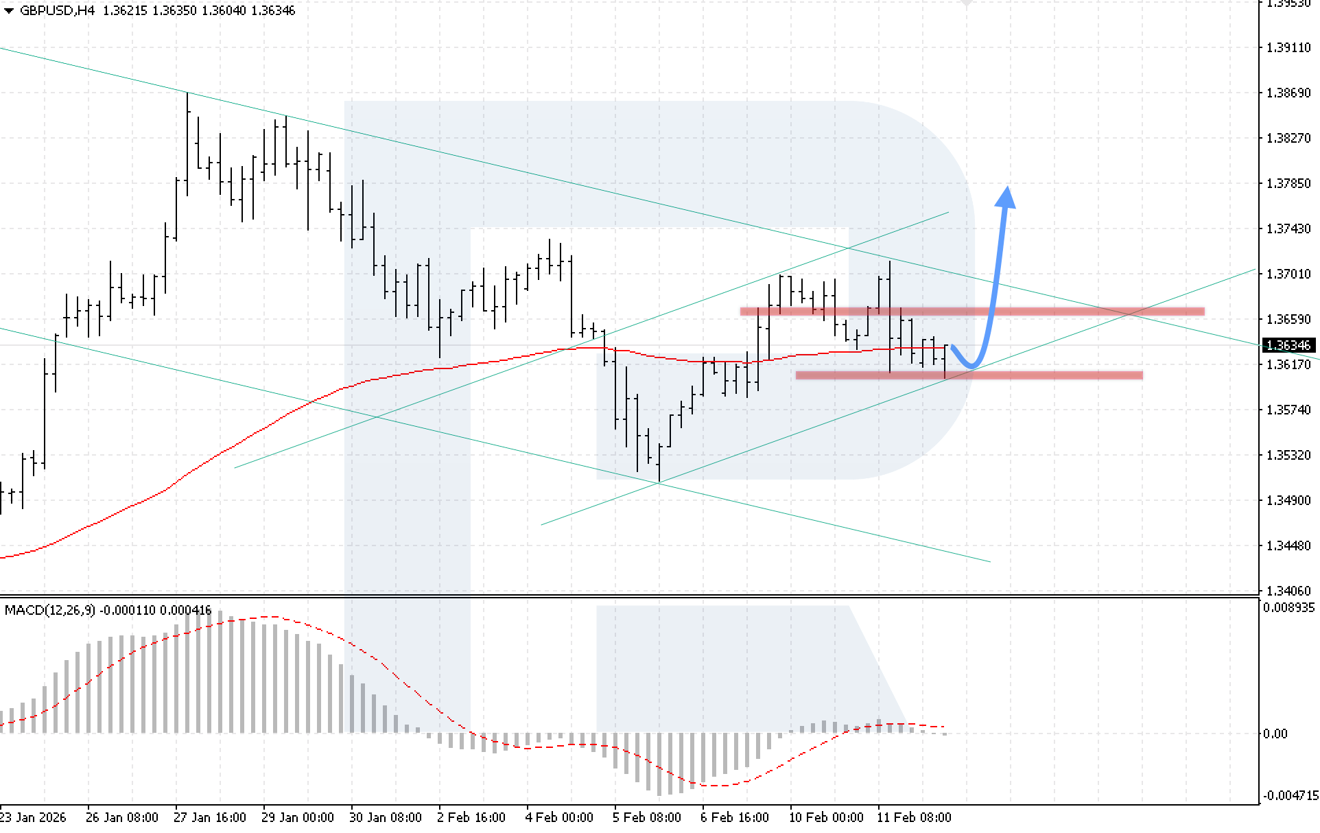 GBPUSD жұбының H4 графигінде баға түзету аясында қозғалып жатыр, ал сатып алушылар EMA-85 сызығынан жоғары бекінуге тырысуда. Ең жақын қолдау 1.3605 деңгейінде орналасқан. Бүгін, 12 ақпан 2026, негізгі сценарий бычий арнаның төменгі шекарасынан кері серпіліп, 1.3785 деңгейіне дейін өсуін жалғастыруды қарастырады.
