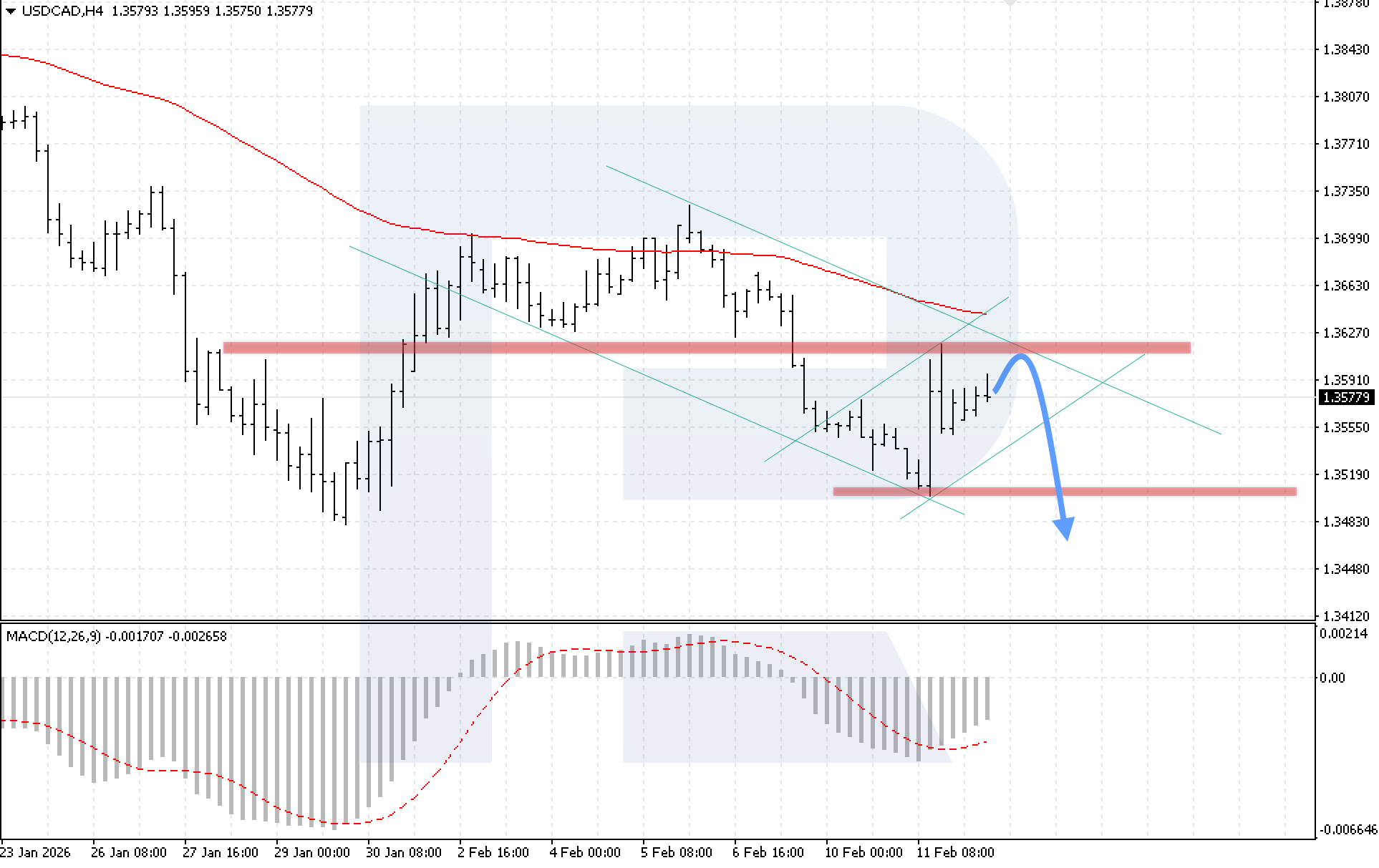 USDCAD жұбының H4 графигінде нарық бычий түзету аясында қозғалып жатыр, алайда баға EMA-85 сызығынан төмен қалып, аюлы қысымның сақталғанын көрсетеді. Бүгін, 12 ақпан 2026, негізгі сценарий 1.3595 деңгейіндегі төмендеуші арнаның жоғарғы шекарасынан кері серпіліп, 1.3475 деңгейіне дейін төмендеуді жалғастыруды қарастырады.