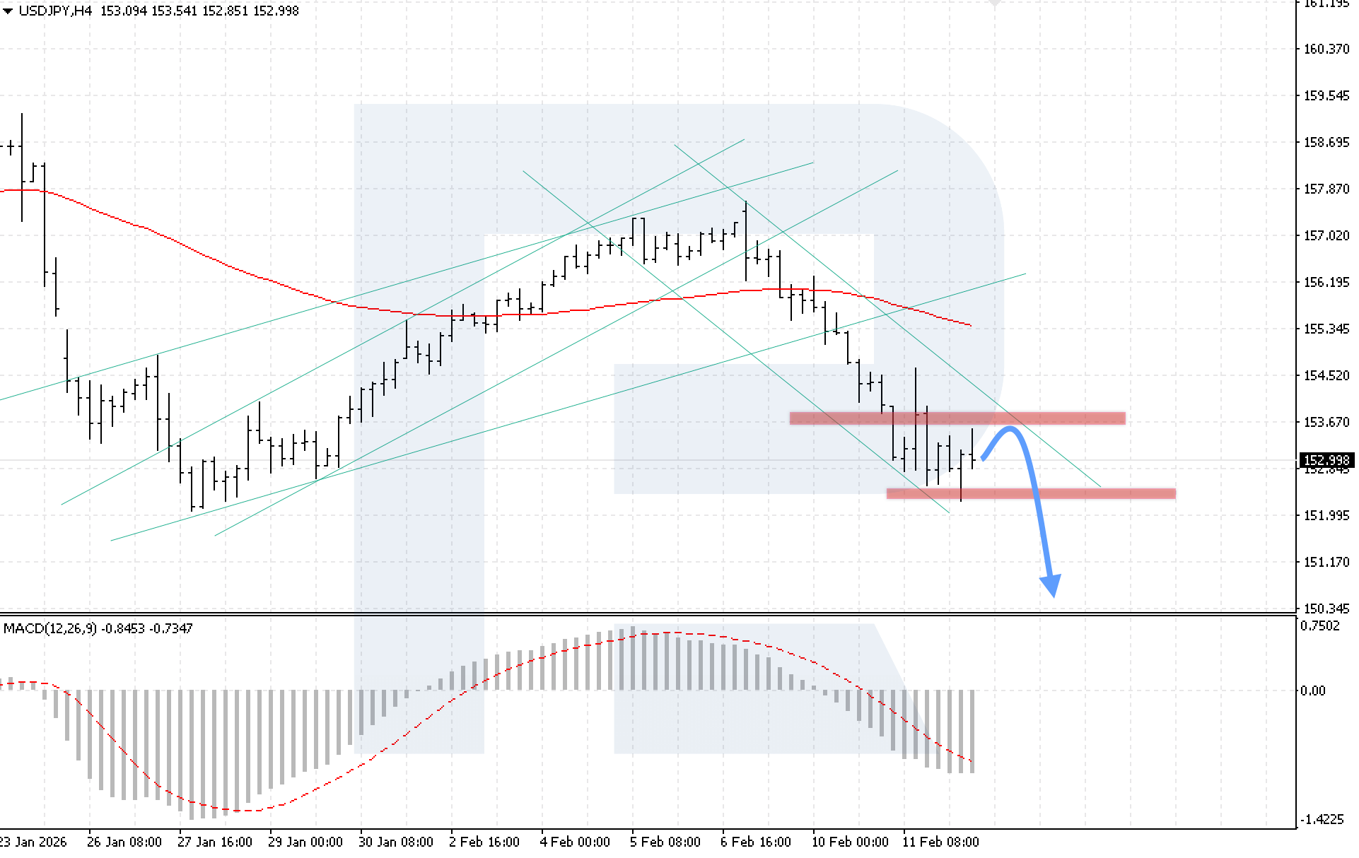 USDJPY жұбының H4 графигінде нарық 153.65 деңгейіндегі қарсылықтан кері серпілгеннен кейін төмендеуші арна аясында белсенді құлдырауды көрсетуде. Ең жақын қолдау аймағы 152.15 деңгейінде орналасқан. Бүгін, 12 ақпан 2026, негізгі сценарий 150.55 деңгейін мақсат еткен төмендеудің жалғасуын қарастырады.